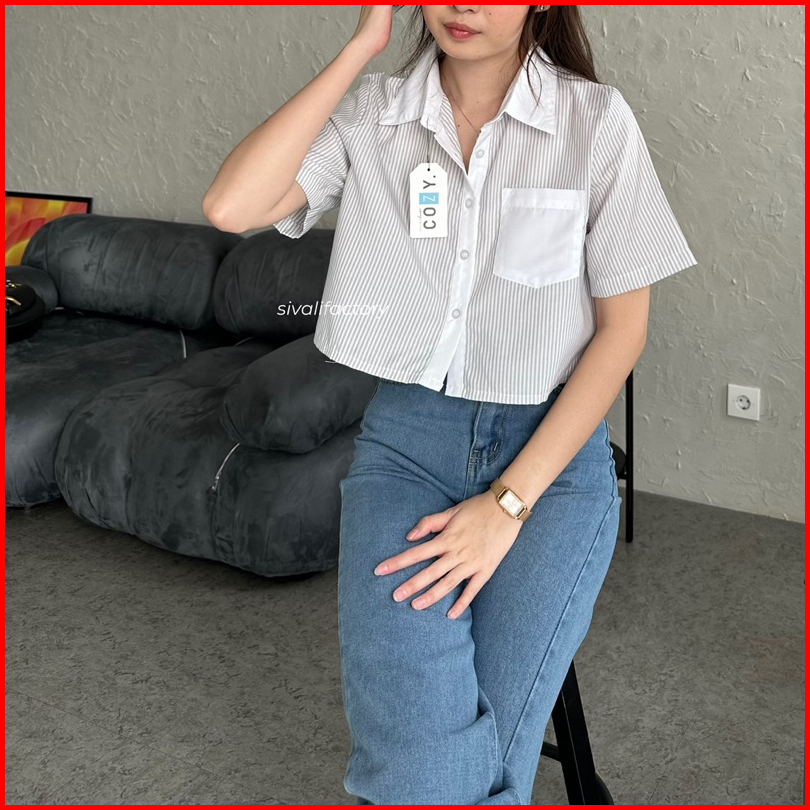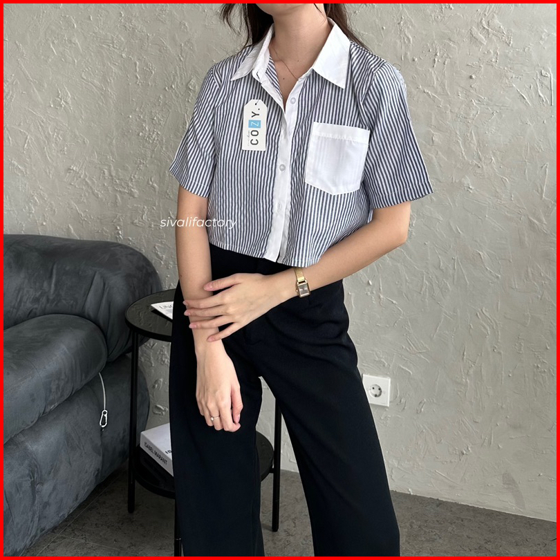 Sivali Gia Stripe Shirt Crop Stripe Shirt Kemeja Wanita Salur Lengan Pendek Atasan Wanita Garis 123