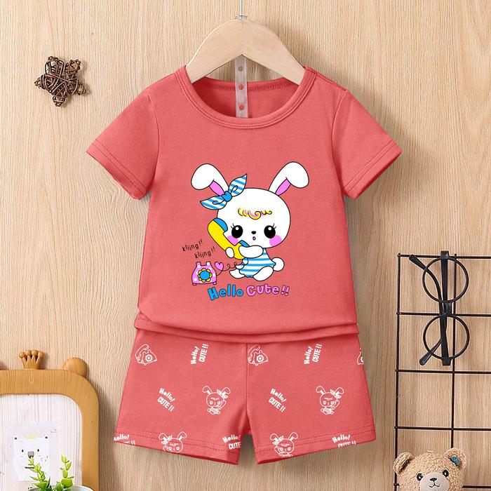 KITAS SETELAN BAJU ANAK PEREMPUAN LENGAN PENDEK UMUR 1-6 TAHUN KATUN PE PARSEL SIZE S-3XL COCOK UNTUK HARIAN & SANTAI - PEACH RABBIT, S