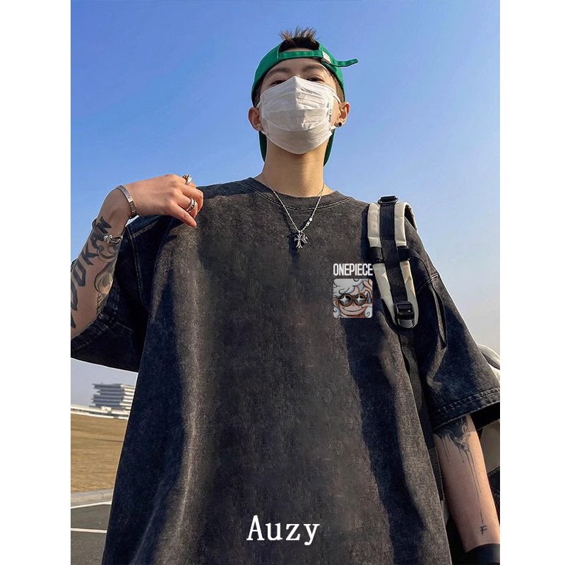 AUZY One Piece Luffy Kartun pola Gaya Amerika Retro washed hitam kaos pria wanita atasan Lengan Pendek T shirt skena baju oversize t shirt distro original 100 PERSEN