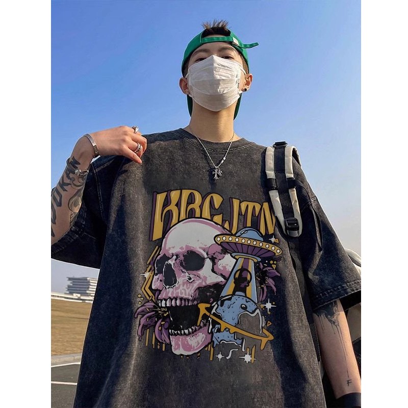 AUZY Hip hop Amerika Tengkorak Hitam washed kaos pria wanita T shirt baju oversize t shirt distro