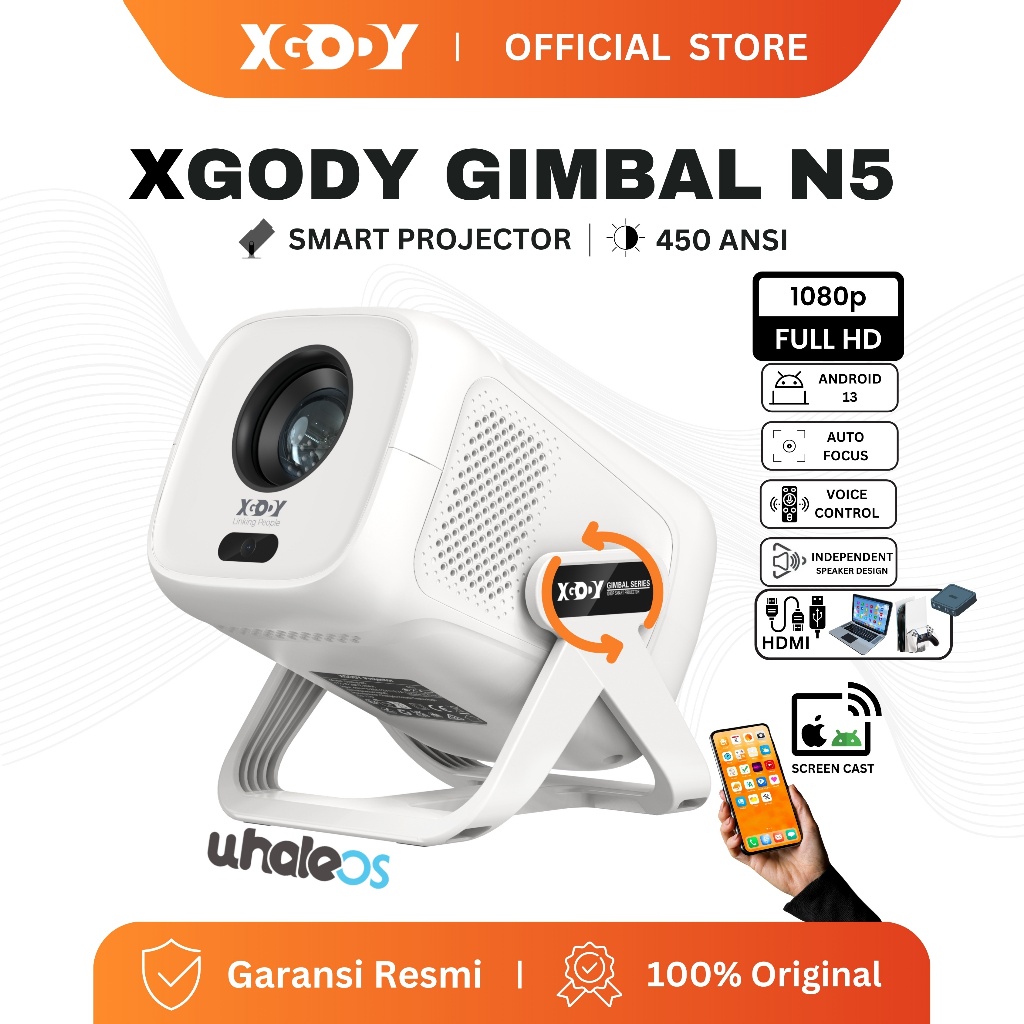 XGODY Gimbal N5 Smart Proyektor LCD - FHD 1080P-WhaleOs3.0 System-Voice Control-450ANSI-Dolby Audio