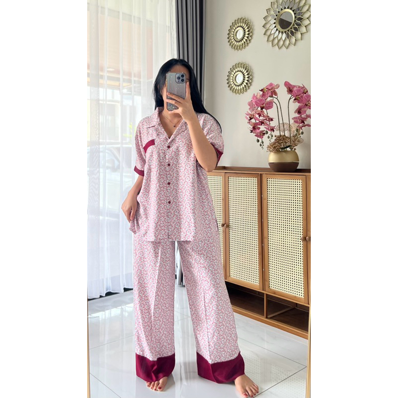 Gentlesleep (PINK FLOWER) One Set Baju Tidur Kekinian Setelan Busui Katun Premium Rayon Wanita Lokal