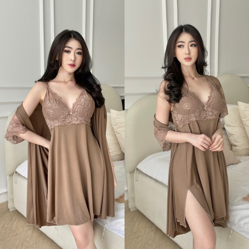Chelsii Sleepwear Dress Kimono + Panties + Belt in Mocca Color
