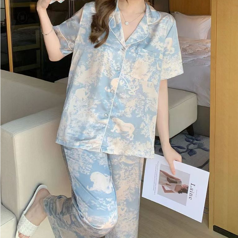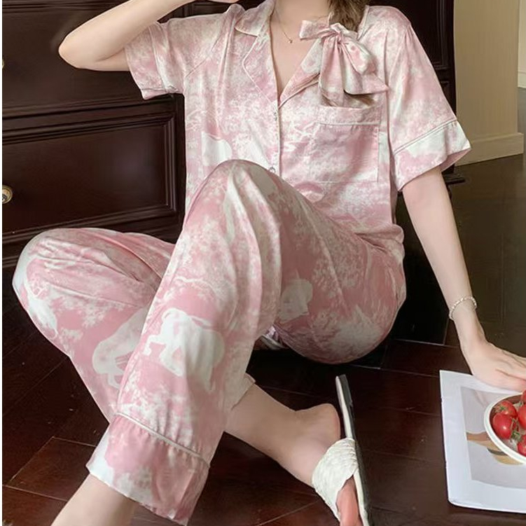 2025 piyama sutra sutra es tie-dye baru piyama wanita sutra manis dan indah angin lengan pendek celana panjang cardigan pakaian rumah longgar bisa dipakai di luar