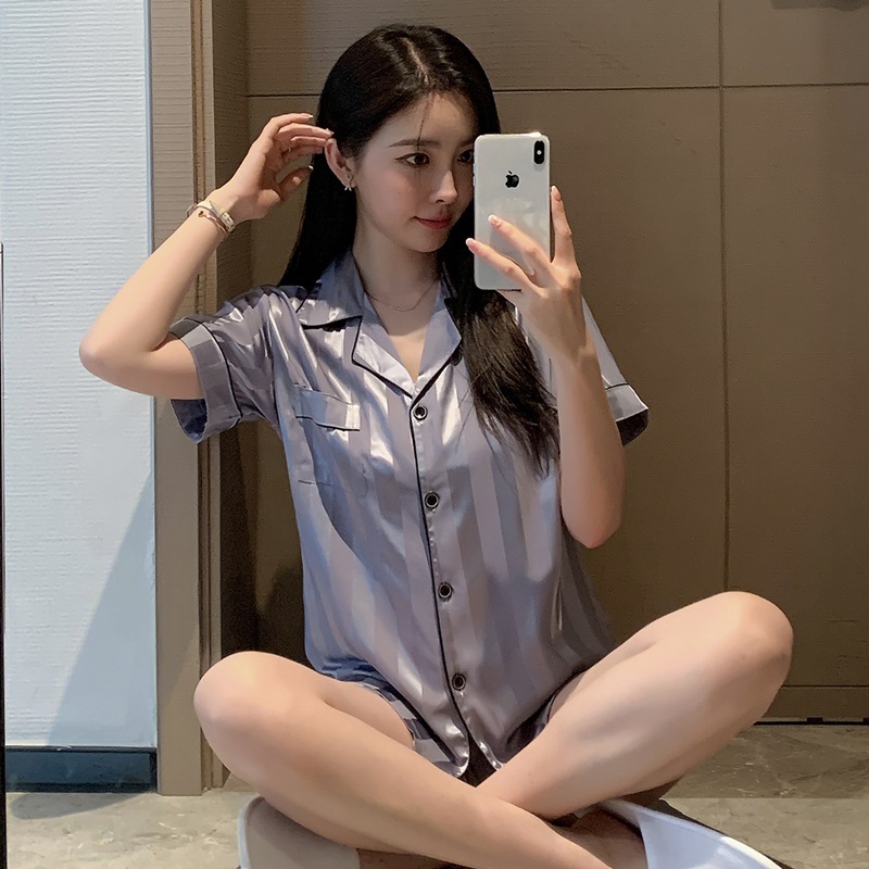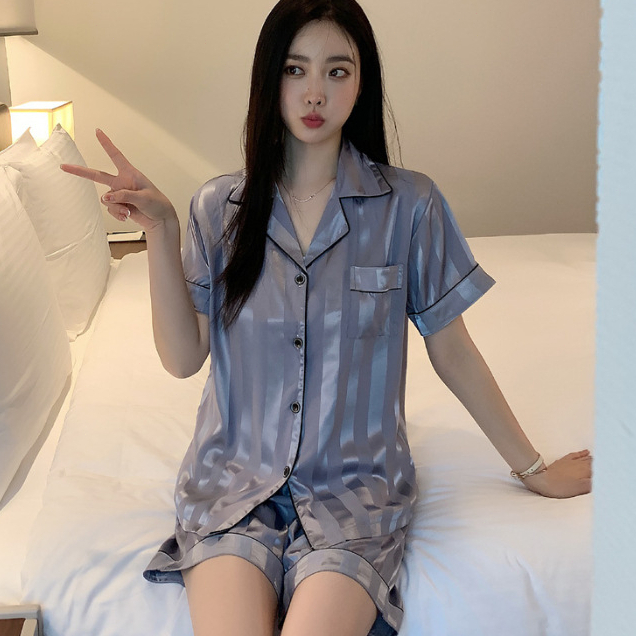 2025 garis-garis vertikal baru sutra es sutra piyama wanita baju pendek lengan pendek setelan pakaian rumah