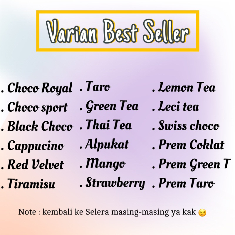 Vanilla Latte, Anggur/grape, Mochacino, Green Tea Latte, Blueberry, Premium Green Tea, Choco Mil•low, Coffee Caramel, Hazelnut, Permen karet pink