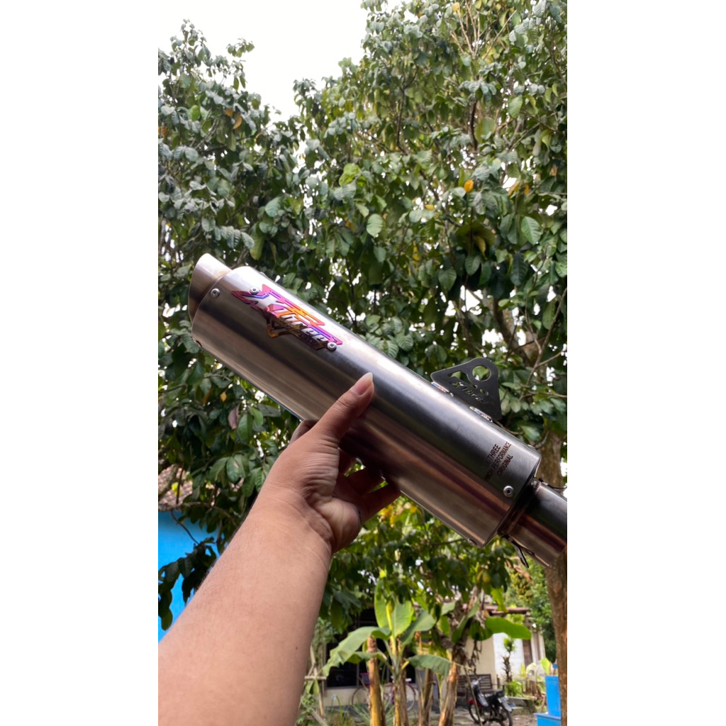 KNALPOT RACING XTHREE TYPE LONG PUTIH EMBLEM PELANGI KNALPOT R15v3,R15v4,R15V2,cbr150r,cb150r,gsx,vixion,byson,mt15,xabre,verza