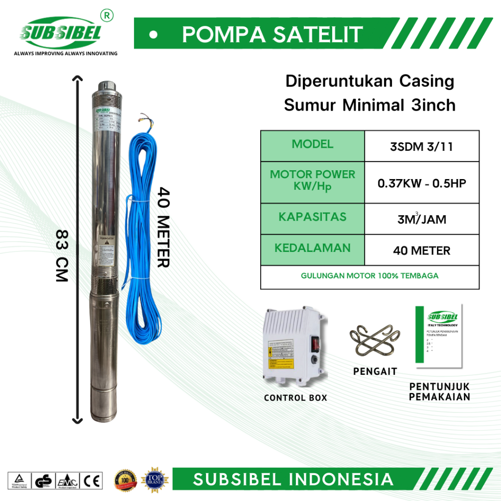 POMPA SUBMERSIBLE 3SDM 3/11 - 0.5HP + KABEL 40 METER - SUBSIBEL INDONESIA