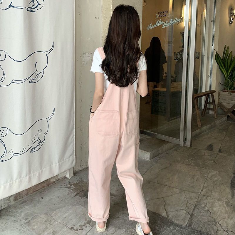 Jumpsuit Wanita Terusan Denim Merah Muda Versi Korea Wanita Longgar Jumpsuit Kaki Lurus Berpinggang Kecil