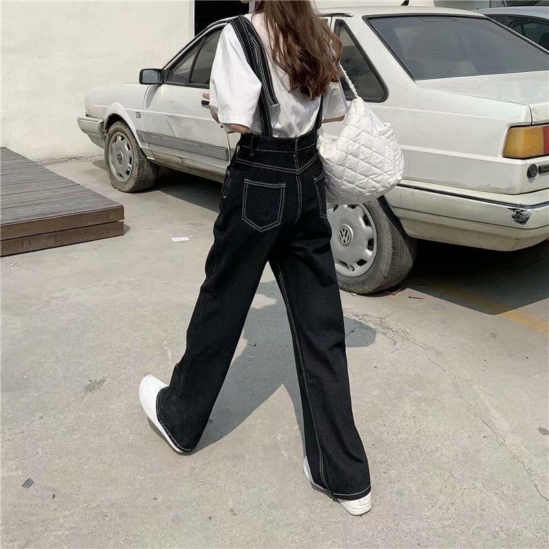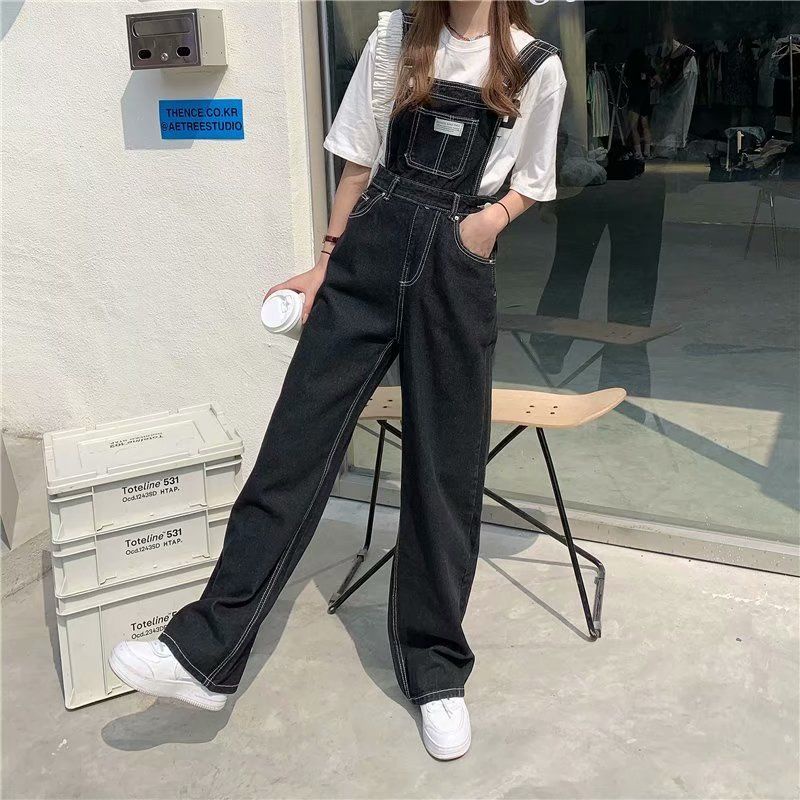 Overall Jeans Wanita Celana Strap Denim Hitam Premium
