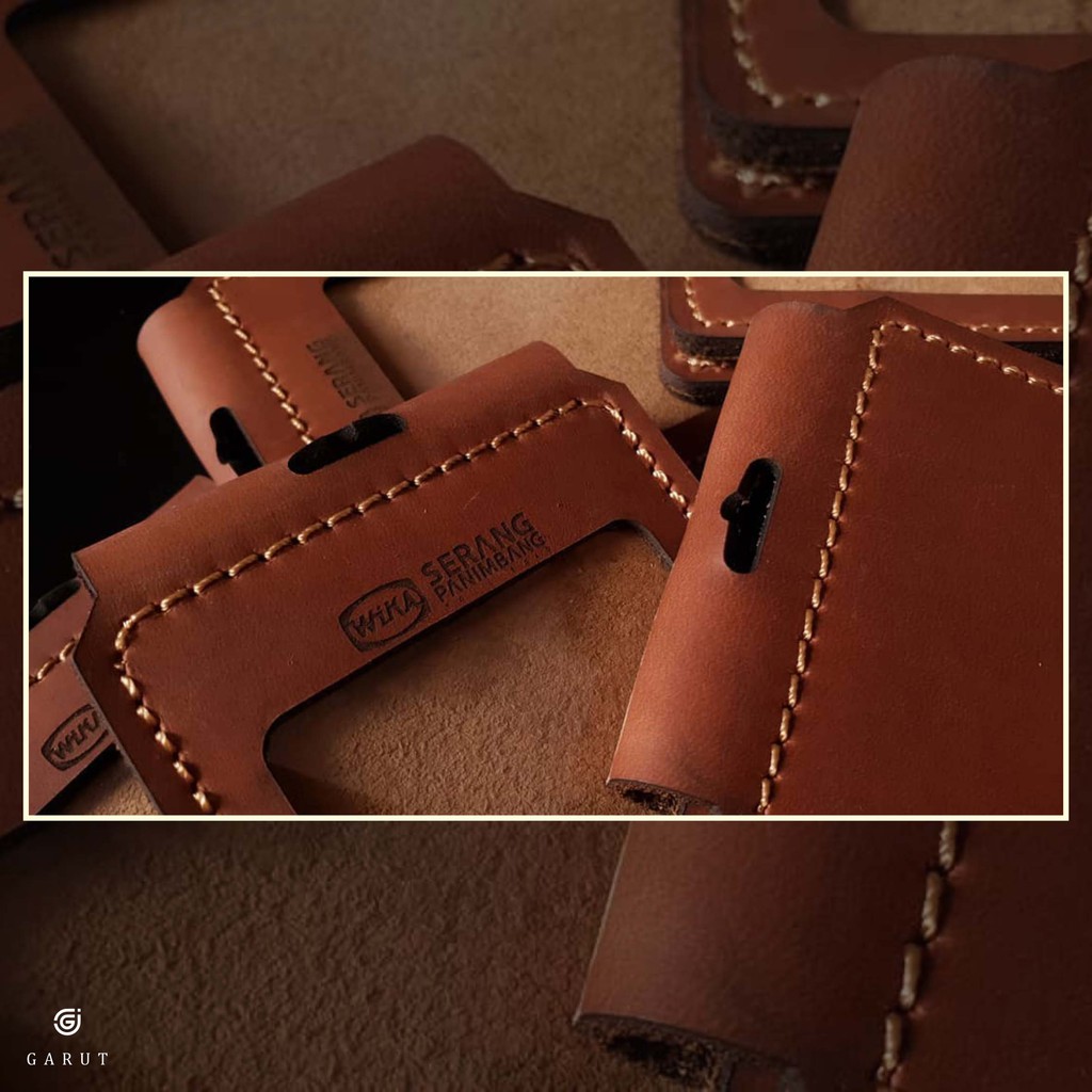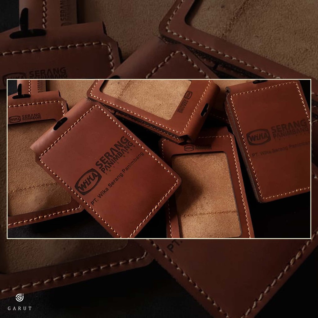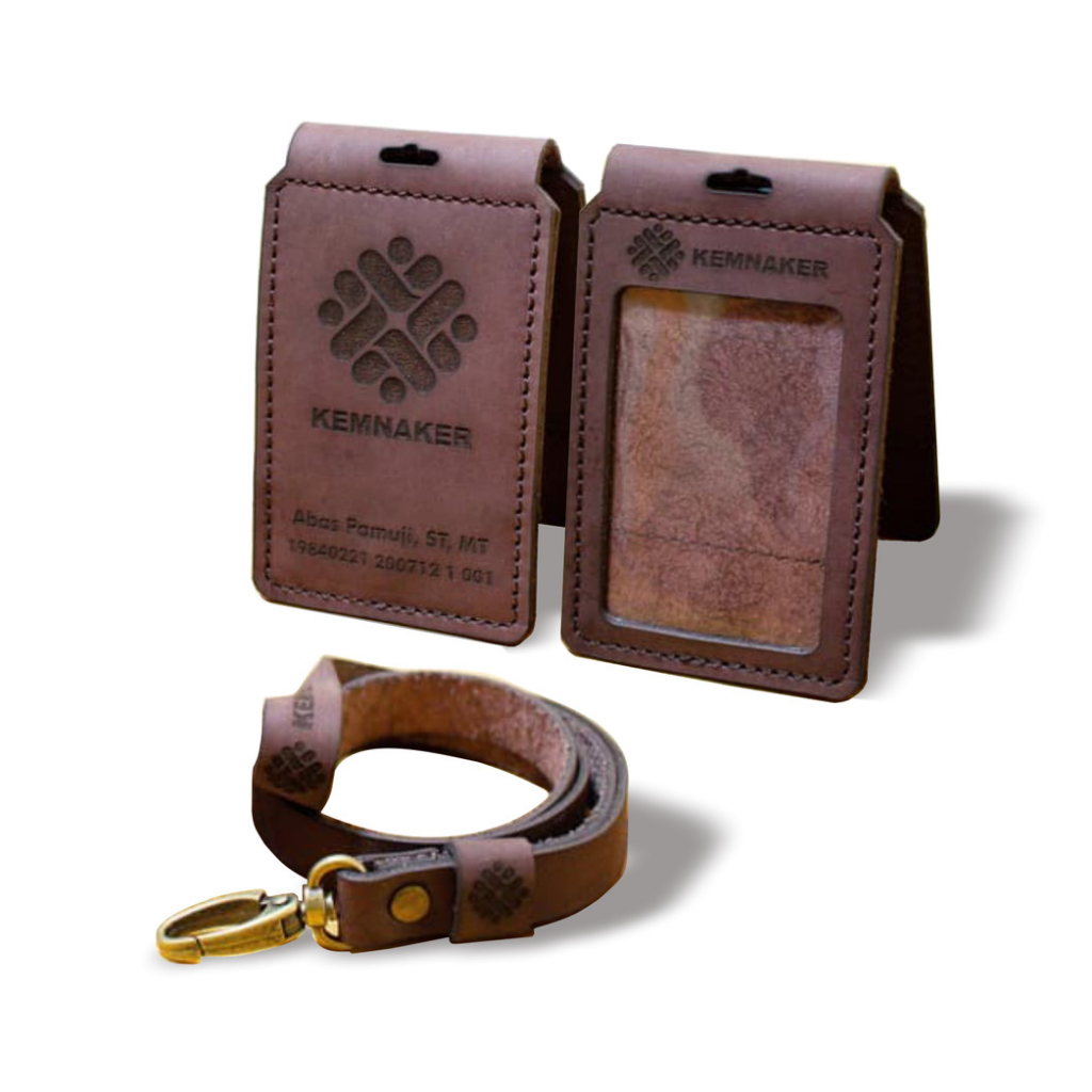 id card kuilit sapi asli custom gantungan lanyard nametag holder magnet lipat saku depan logo satuan