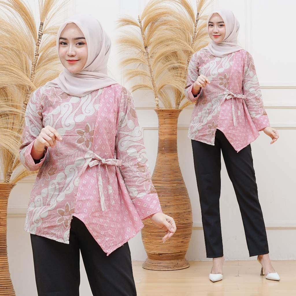 Blouse Batik Wanita Tali Samping Asimetris Atasan Lengan Panjang Modern Model