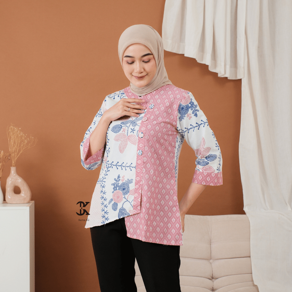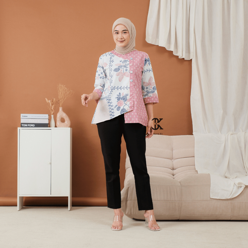 Batik Wanita Modern Kerja Lengan 3/4 Kancing Depan Katun Premium Baju Atasan Kantor Elegan Terbaru