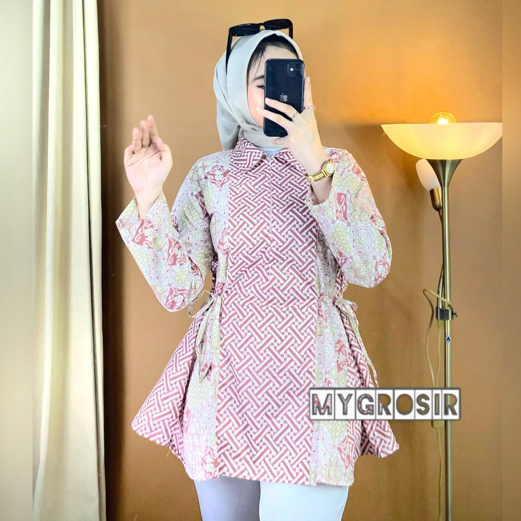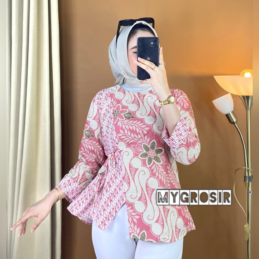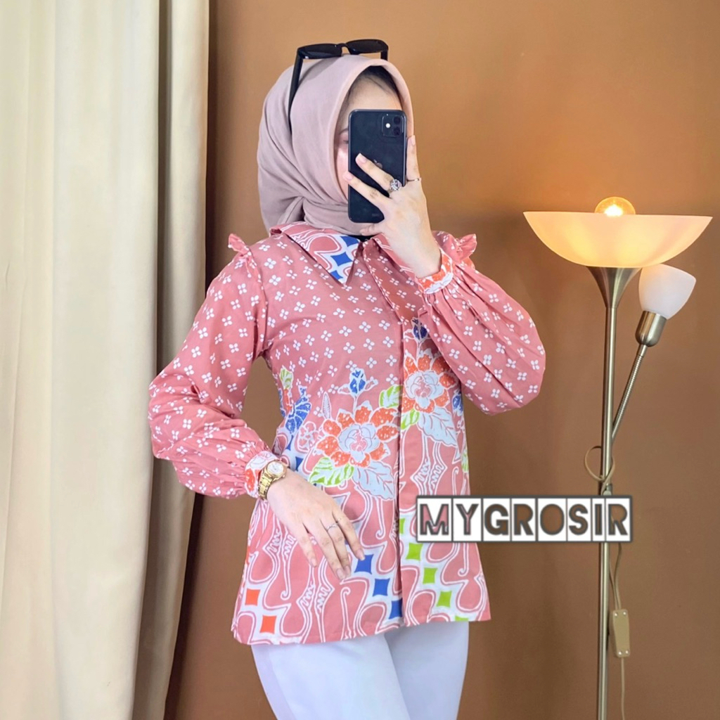 Blouse Batik Wanita Lengan Panjang – Atasan Batik Modern Premium Elegan Kekinian Kemeja Kombinasi Motif Aira Pink