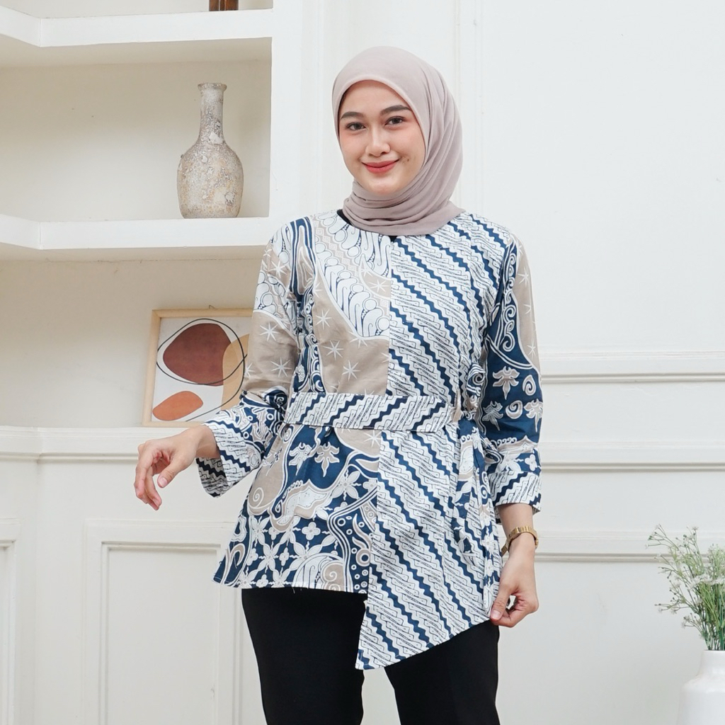 Batik Kerja Premium Motif Piramid Atasan Batik Wanita Modern Lengan Panjang Kombinasi