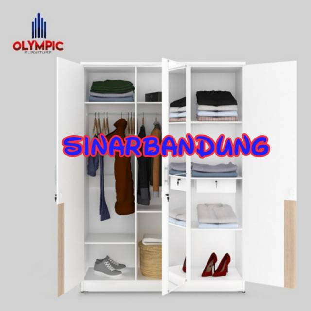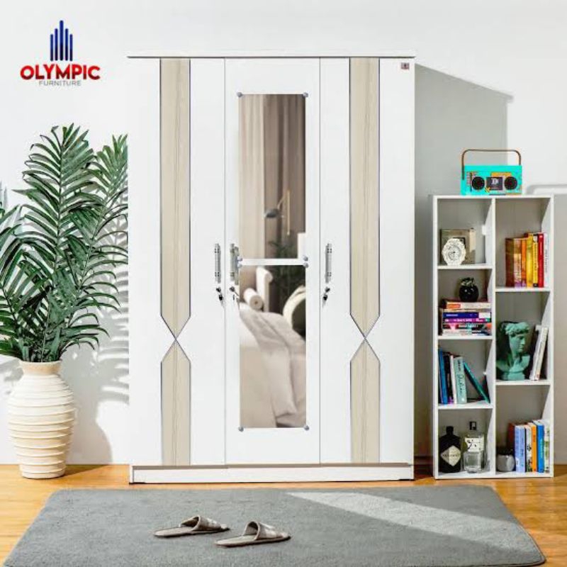 OLYMPIC LEMARI KAYU TIGA PINTU KACA PANJANG / LEMARI PAKAIAN PUTIH MERIBEL