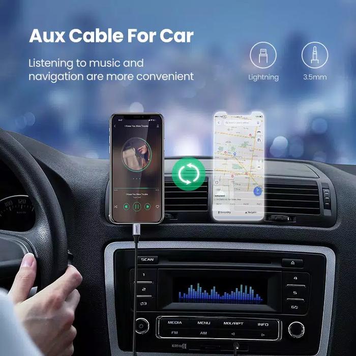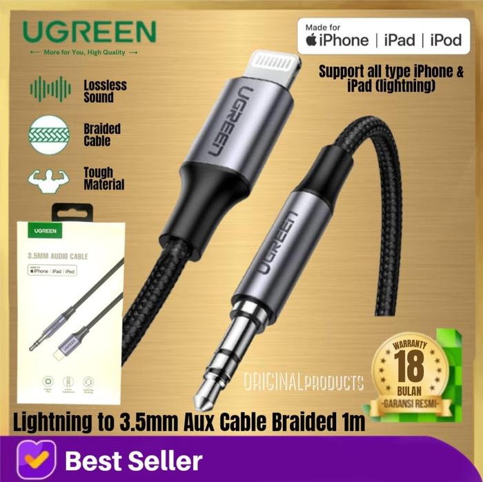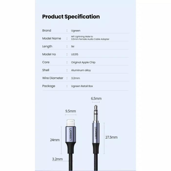KABEL UGREEN LIGHTNING MFI KE AUDIO JACK 3.5MM1M UNTUK IPHONE DAN IPAD - HEADPHONE, GREY, BLACK, SPLITTER SPEAKER ALUMINIUM - 30756 FEMALE