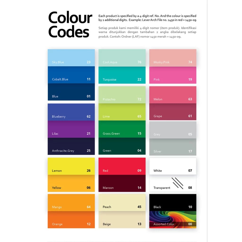 09 Red, 23 Skyblue, 12 Orange, 19 Pink, 07 White, 21 Lilac/Ungu, 26 Lemon, 15 Grass Green, 06 Yellow, 65 Lime