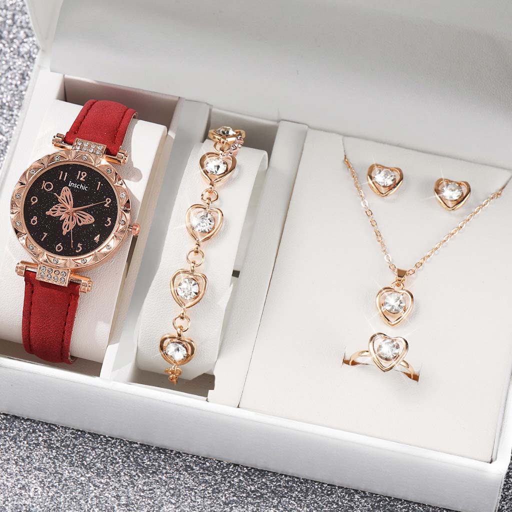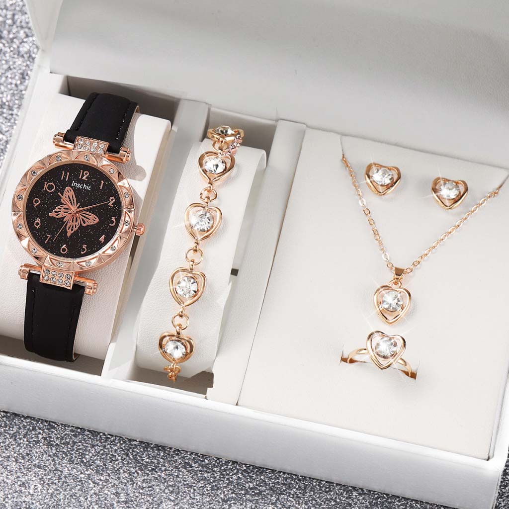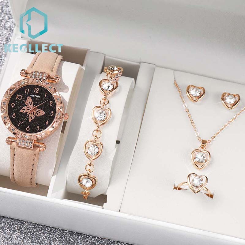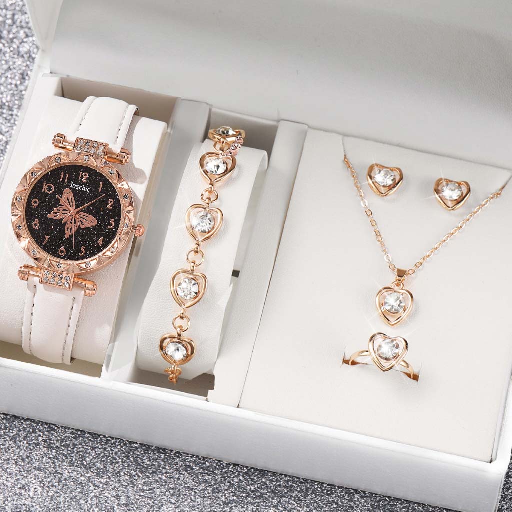 6 Pcs Jam Tangan Kuarsa Kupu-Kupu Wanita Dengan Aksesoris Fashion Mutiara Jam Tangan Sabuk Wanita Baru