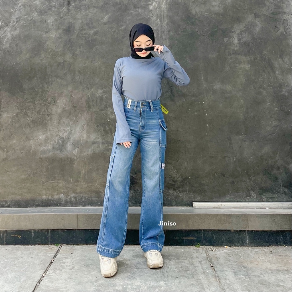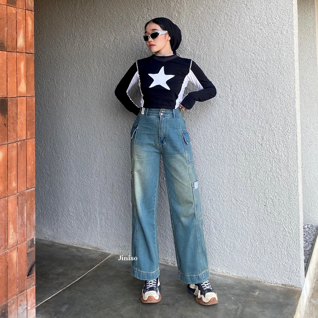 celana jeans wanita jiniso jumbo high waist cutbray kulot sobek cargo pants jumbo Highwaist Hands Up jiniso official