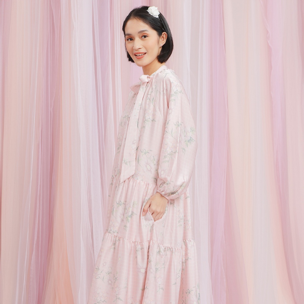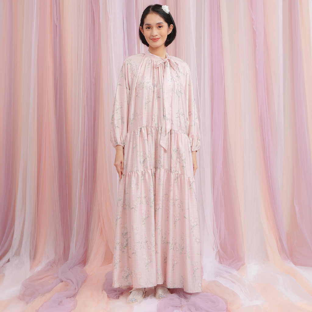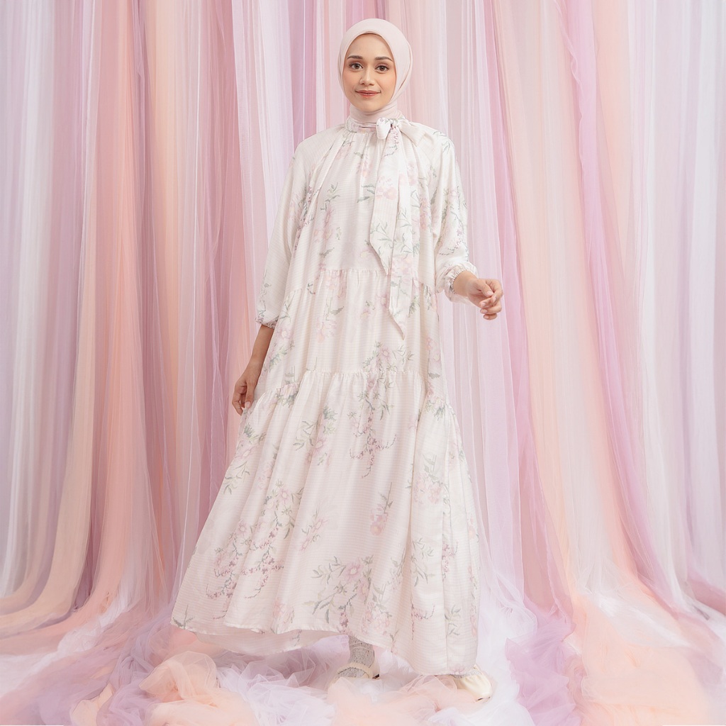 HijabChic Luella Dress - Dress Kondangan Layer A Line Motif Bunga Satin Premium Tali Pita