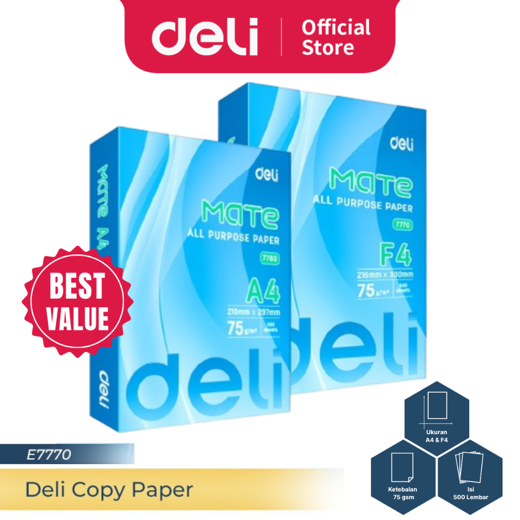 Deli Copy Paper Kertas A4 500 lembar 75 gsm Kertas HVS 1 rim Kertas Fotokopi E77X0