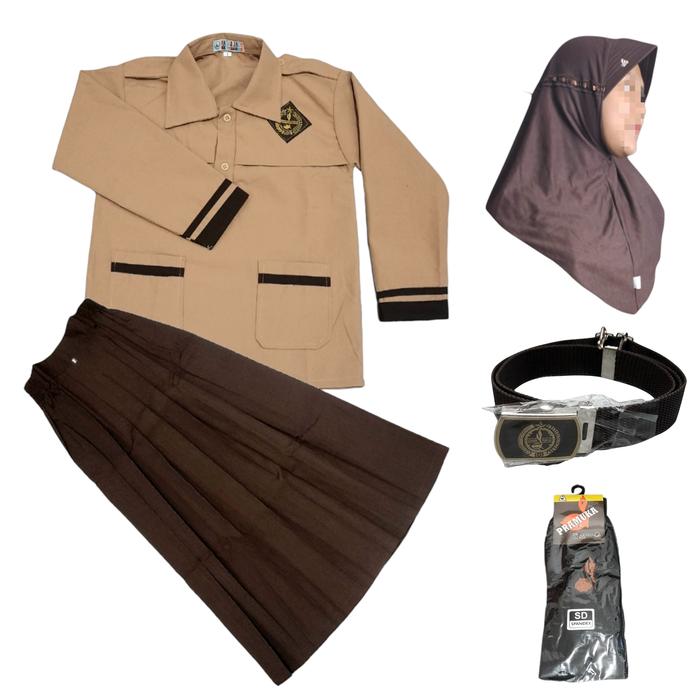 SERAGAM SEKOLAH SD PRAMUKA SIAGA PEREMPUAN LENGAN PANJANG ROK PANJANG SUPER LENGKAP KELAS 1-6 SD - SET HIJAB KOMPLIT, 7 TAHUN