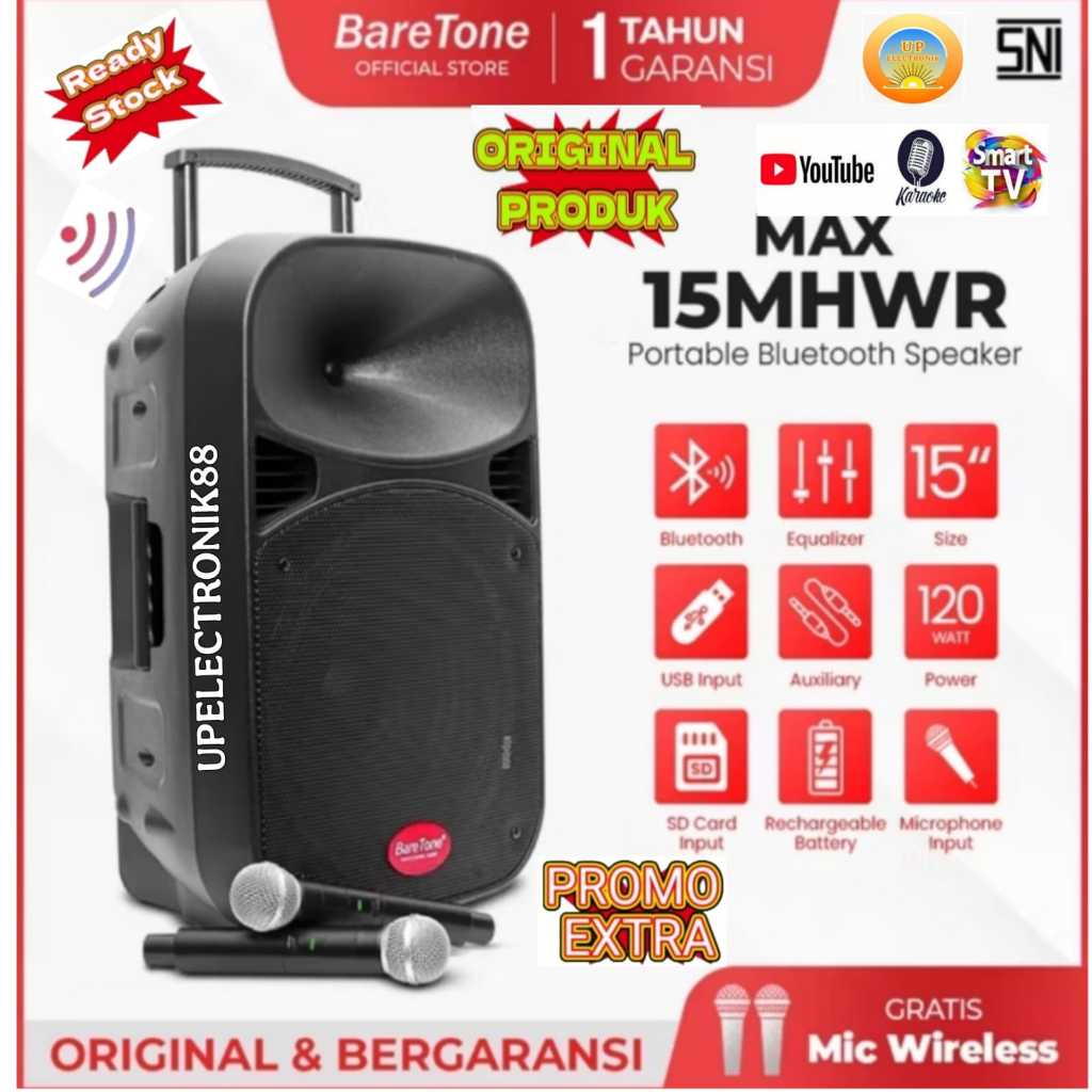 Speaker Aktif Portable 15 Inch Baretone MAX15MHWR Rms 120Watt Usb Bluetooth Original