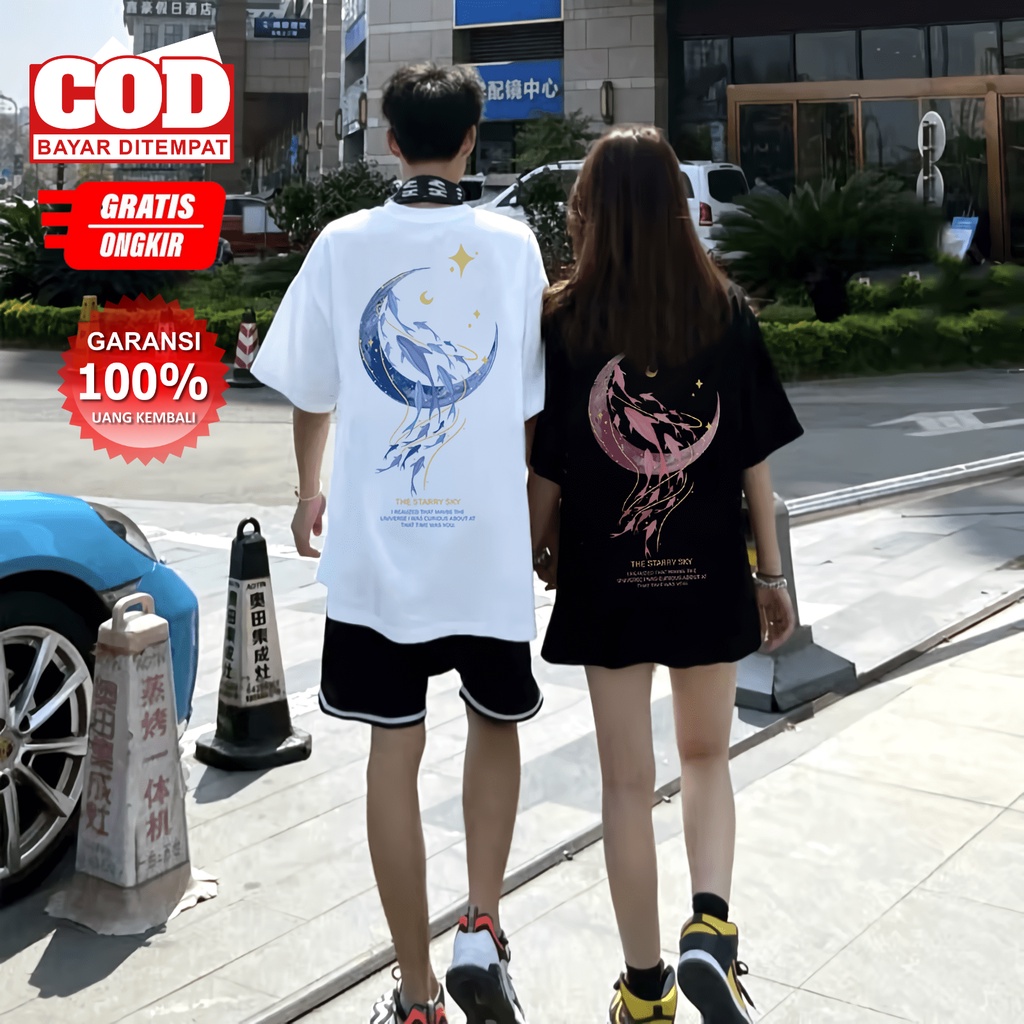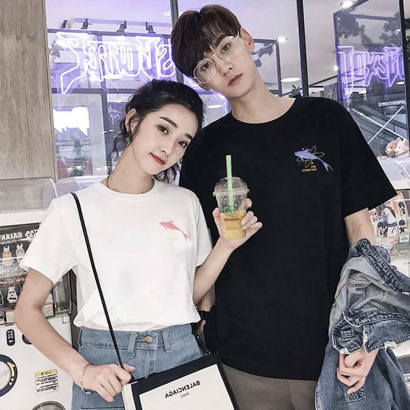 T Shirt Kaos Couple Pasangan Pria Wanita Summer Korean Tee Fashion Starry Sky Harajuku Women Short Sleeve T shirt Blue Whale Graphic INS Loose Large Size Couple Clothing