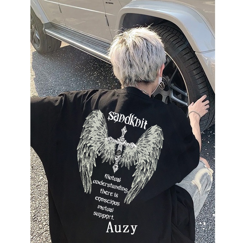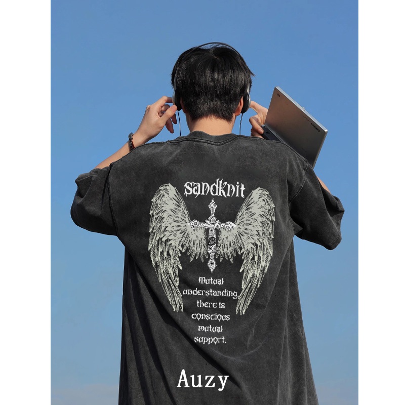 AUZY Hitam washed Retro Amerika Menyeberang Aayap Malaikat kaos pria wanita T shirt baju oversize t shirt distro