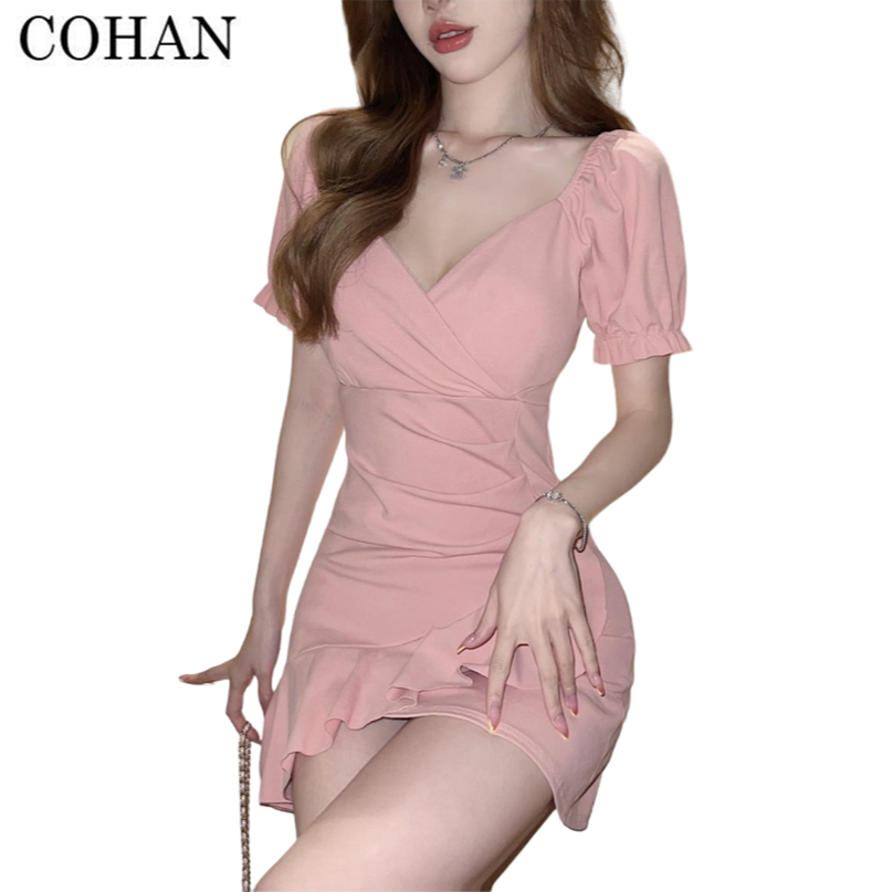 Cohan DR116 Baju Dress MIdi Korea Seksi Lengan Pendek V-neck Pink S/M/L/XL/2XL