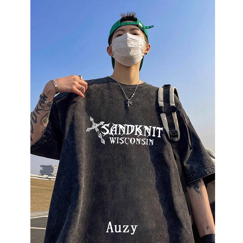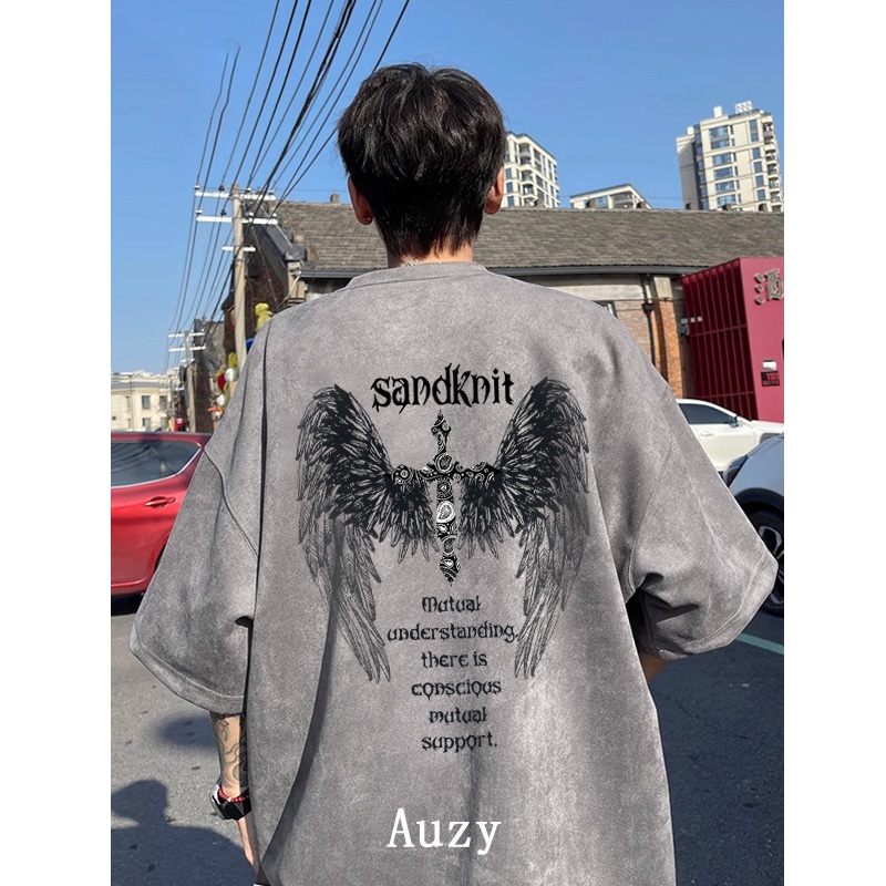 AUZY Hitam washed Retro Amerika Menyeberang Aayap Malaikat kaos pria wanita T shirt baju oversize t shirt distro