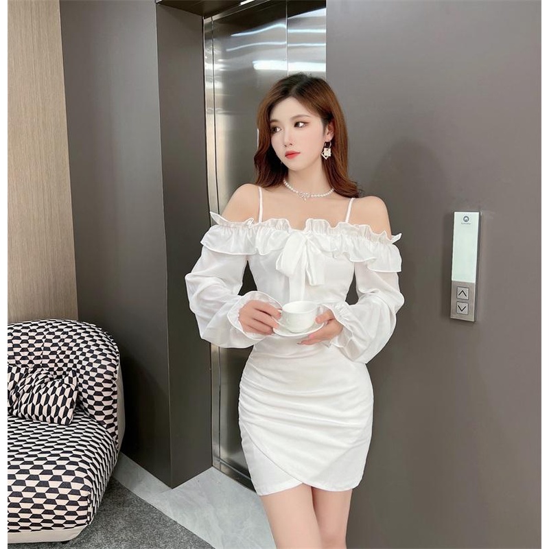 Cohan DR9401 Fashion Tali Kelihatan Bahu Lengan Panjang Dress Korean Mini Cute Putih Hitam S/M/L/XL