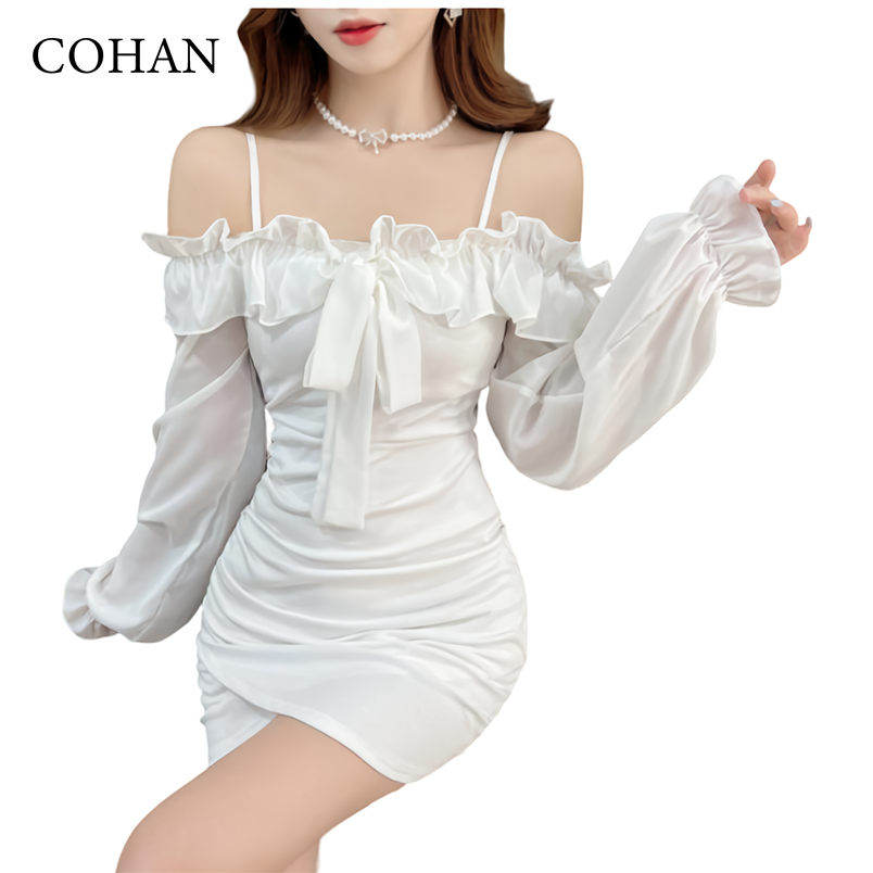 Cohan DR9401 Fashion Tali Kelihatan Bahu Lengan Panjang Dress Korean Mini Cute Putih Hitam S/M/L/XL