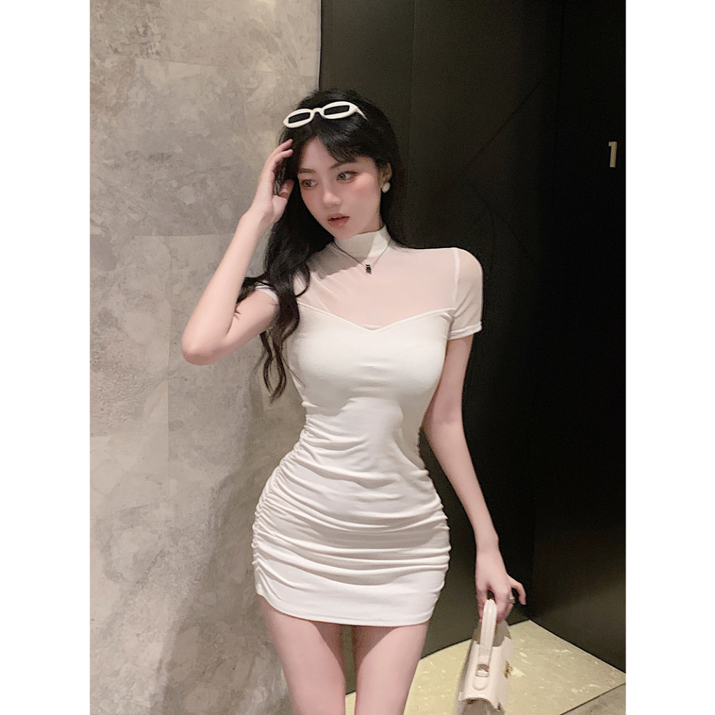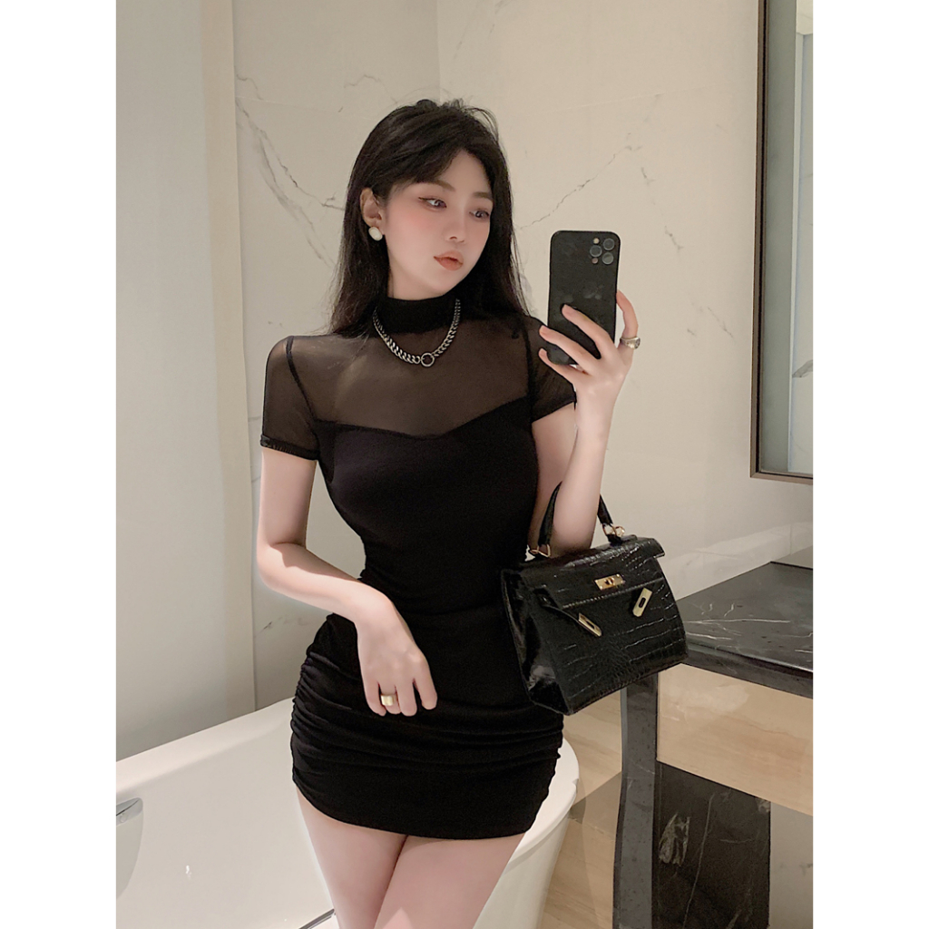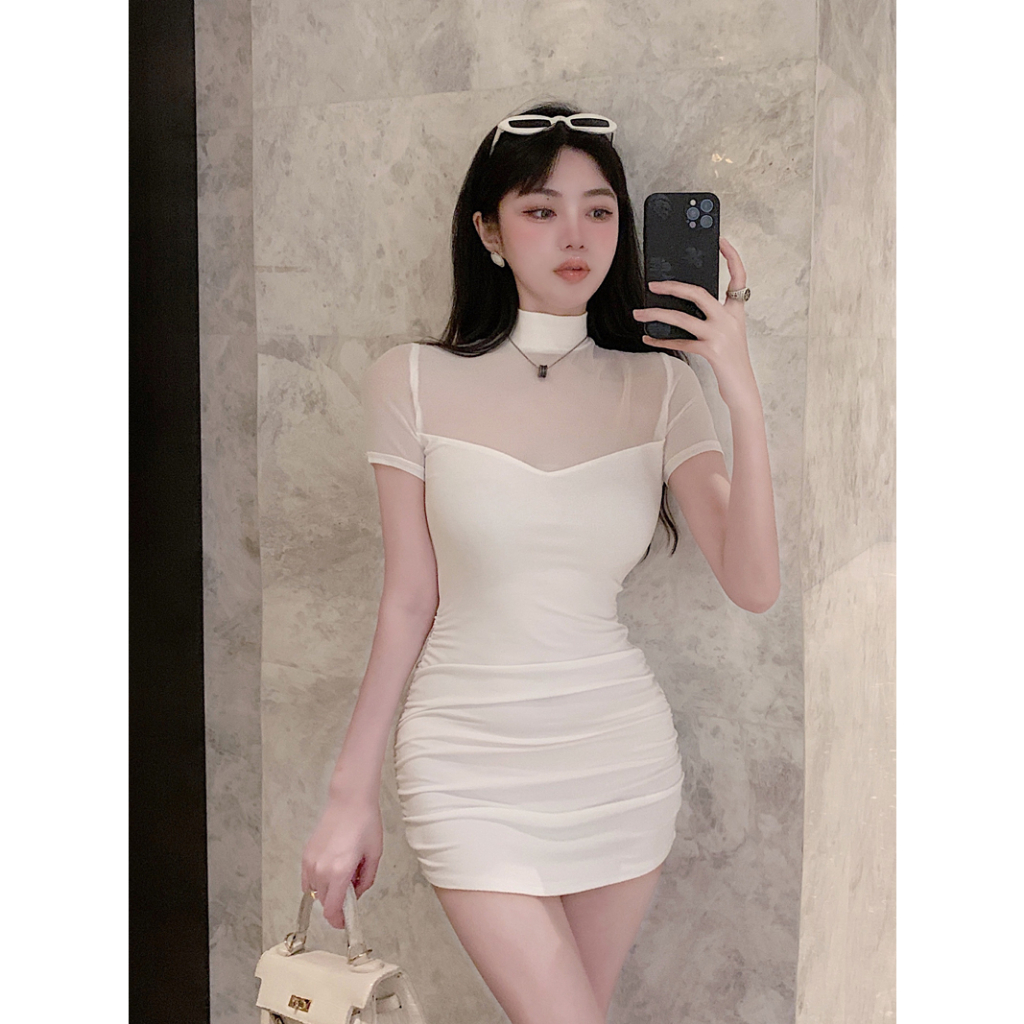 Cohan DR8014 Dress Bodycon Sleeve Mini Leher Penuh Wanita Elegant Hitam Putih S/M/L/XL