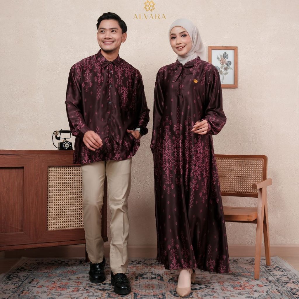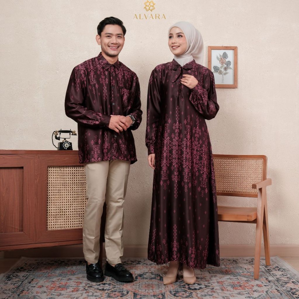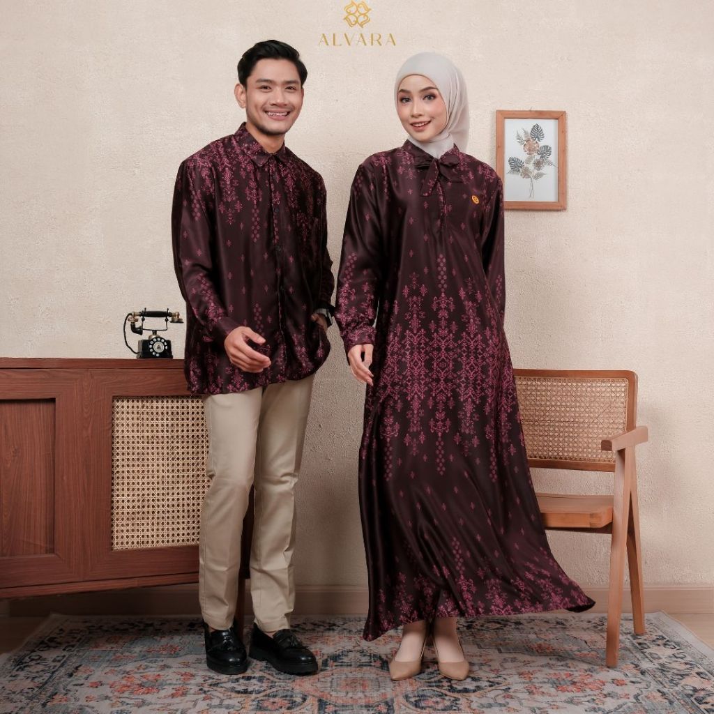 Namaira Maroon Silk Gamis Couple Pasangan Kondangan Dress Kemeja Big Size Jumbo Model Terbaru ALVARA