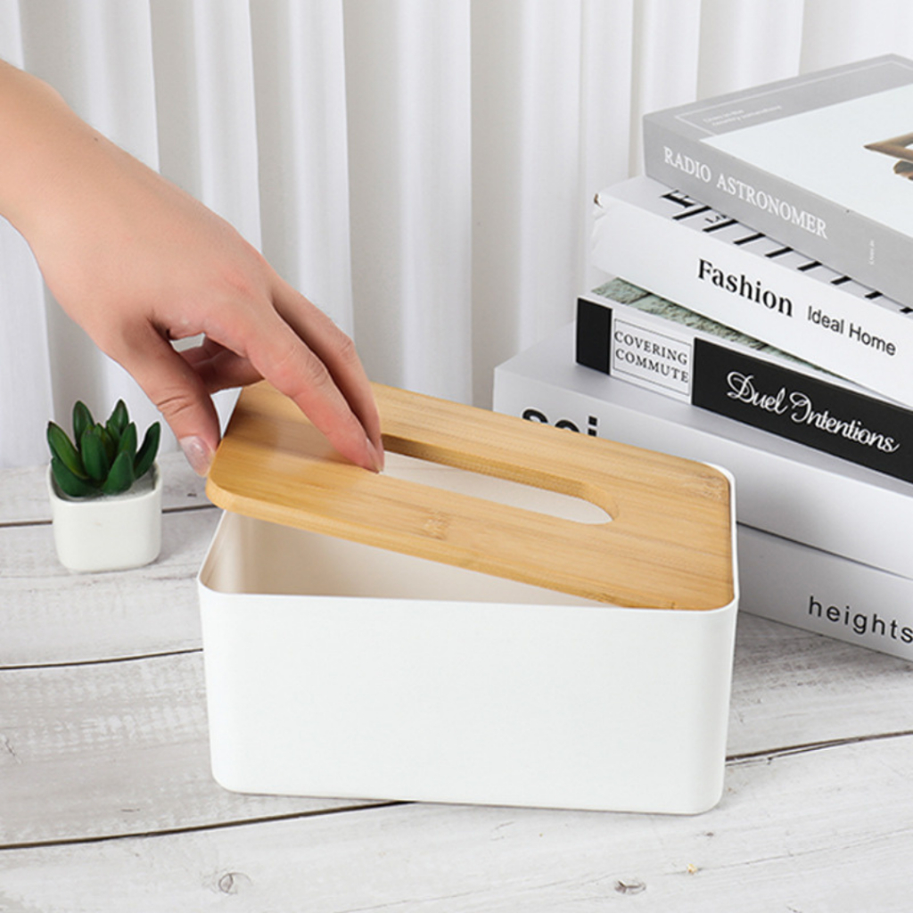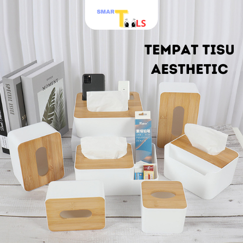 SmartTools - Kotak Tissue Putih Estetik Elegan / Kotak Tisu Putih Tutup Kayu Multifungsi Holder Hp