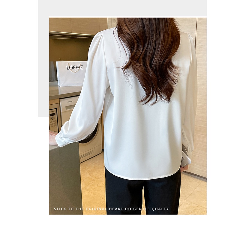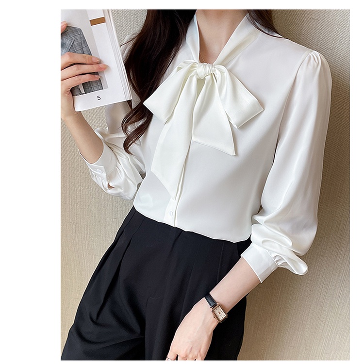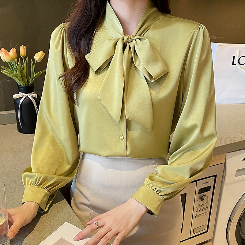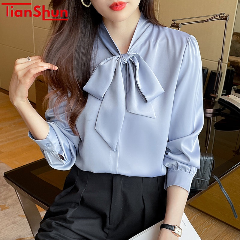 TianShun Women's Solid Blue Green White Apricot bowknot Neck Chiffon Top Long Sleeve Korean Shirt