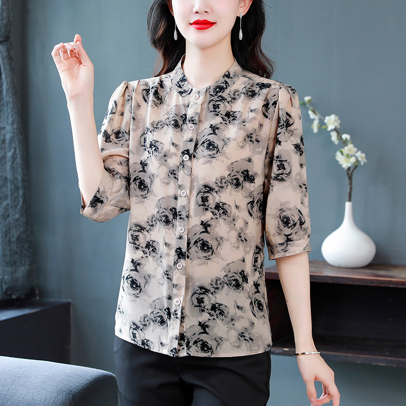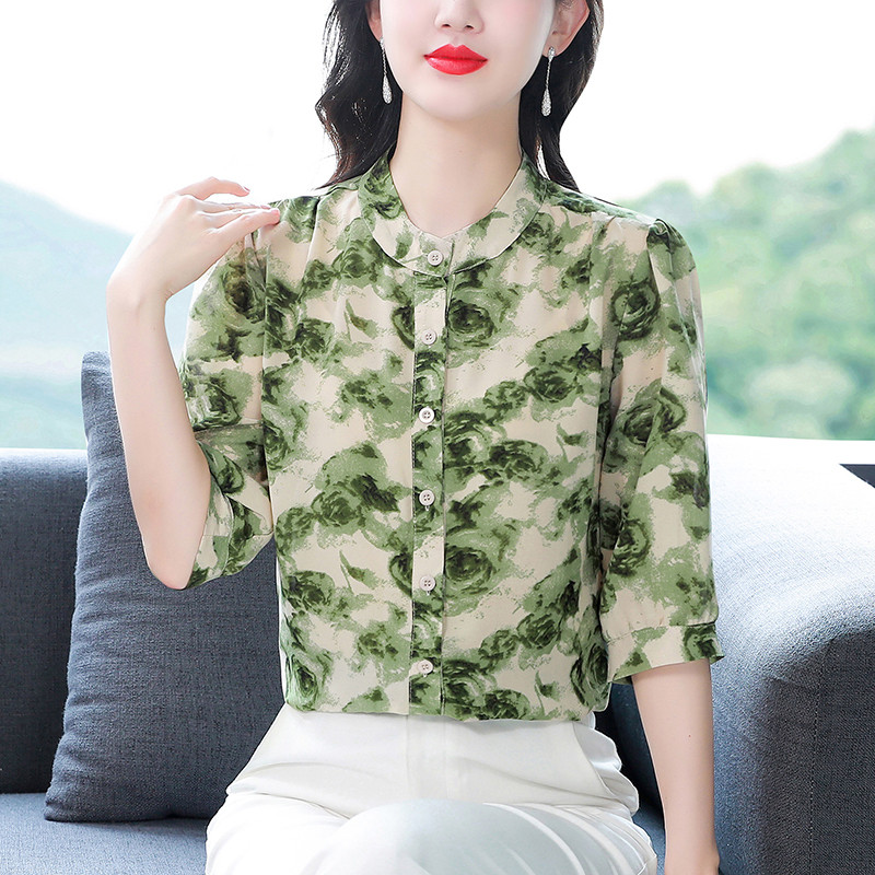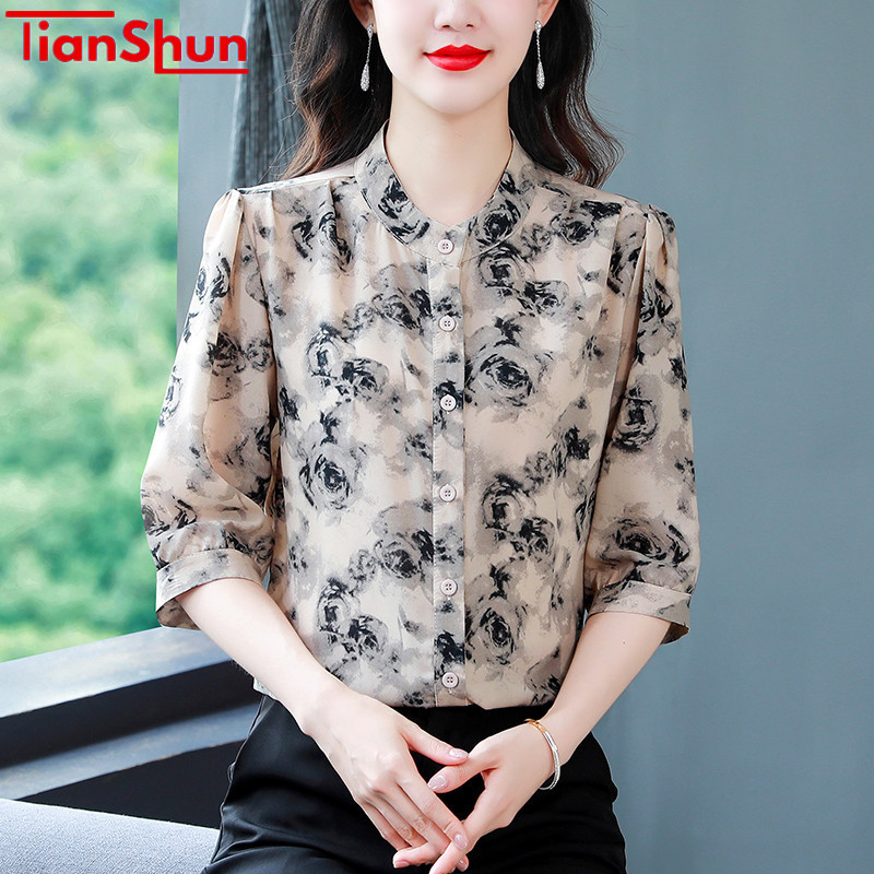 TianShun Flower Top Chiffon Shirt Red Gray Green 3/4 Sleeve Casual Women Blus Wanita Korea