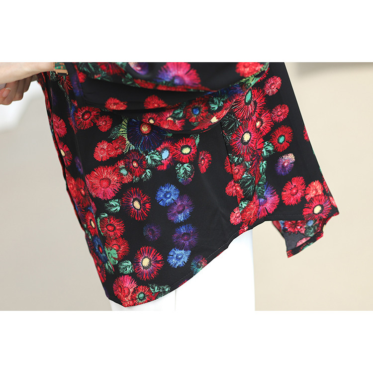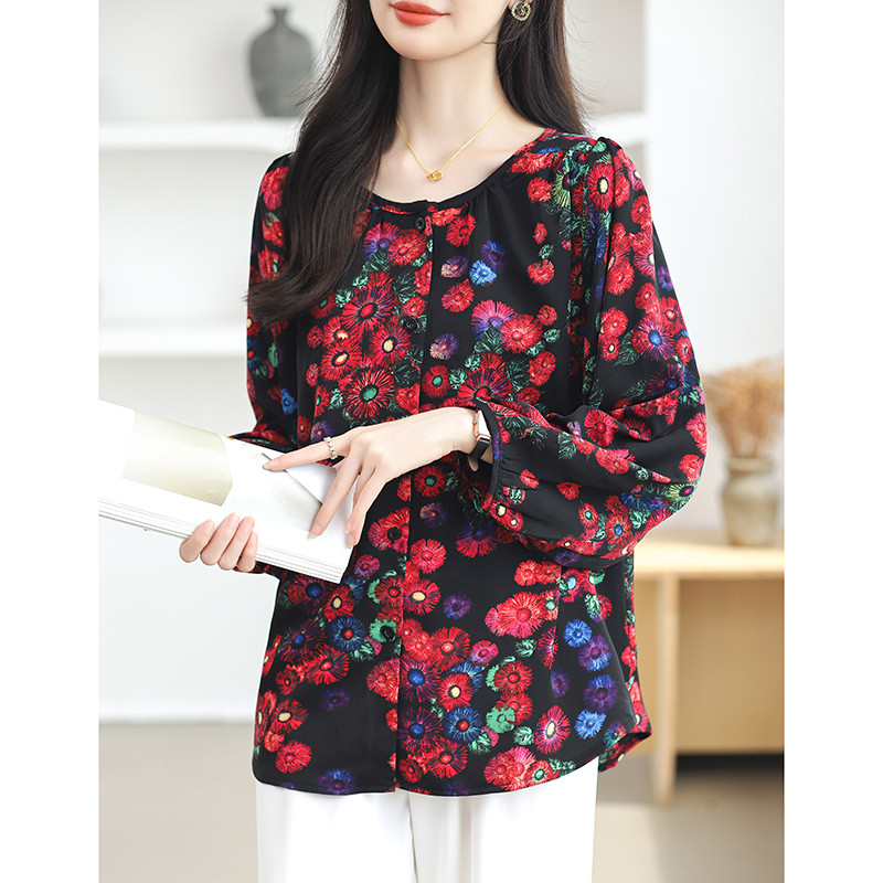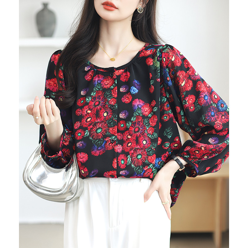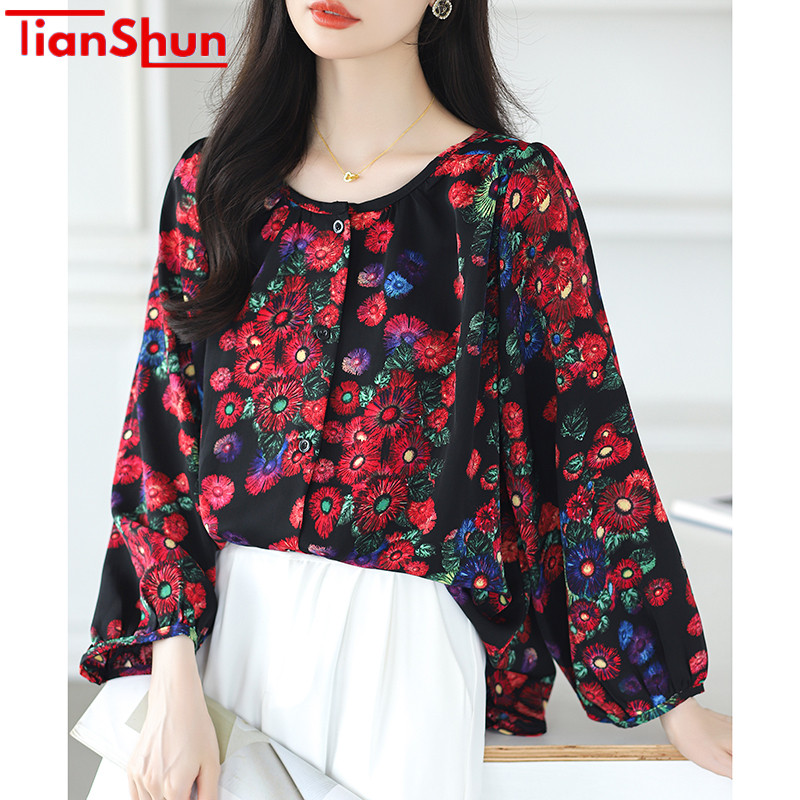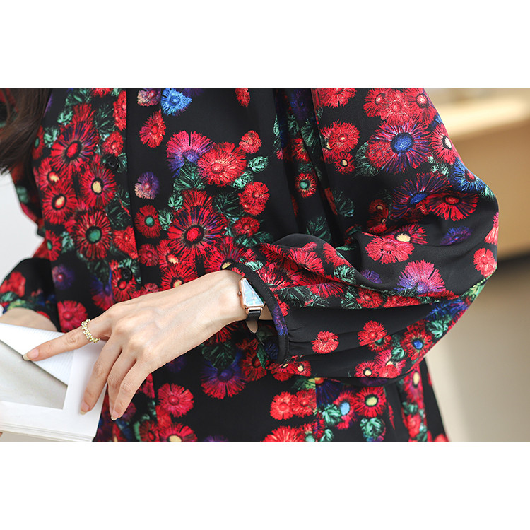 TianShun Versi Korea Bunga Merah Leher Bulat Kemeja Sifon Pesta Perjalanan Thailand Lengan Panjang