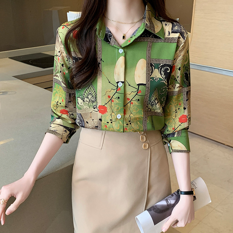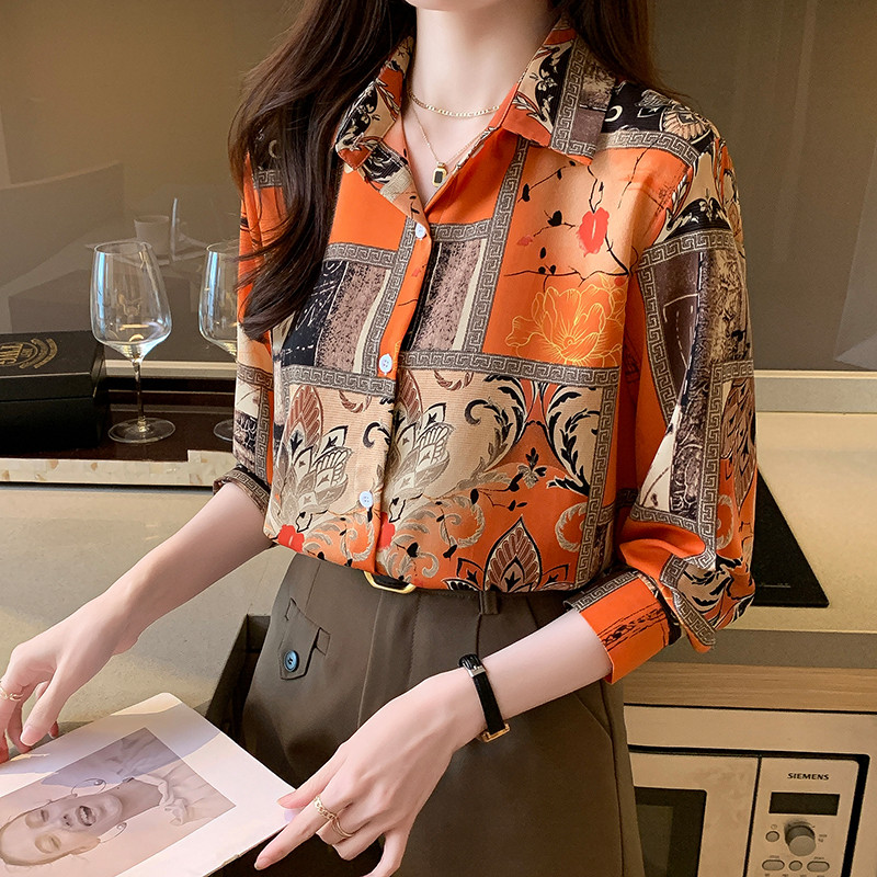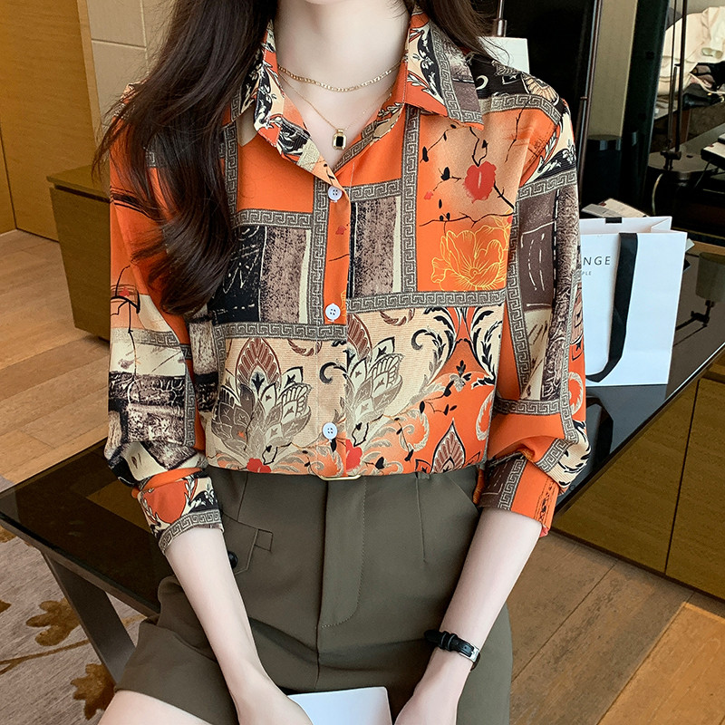 Fashion Korea Kemeja Wanita Sifon Lengan Panjang Oranye Hijau Atasan Kerja Kasual Pantai Longgar
