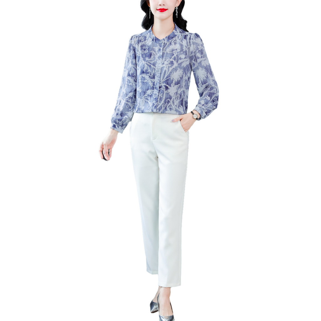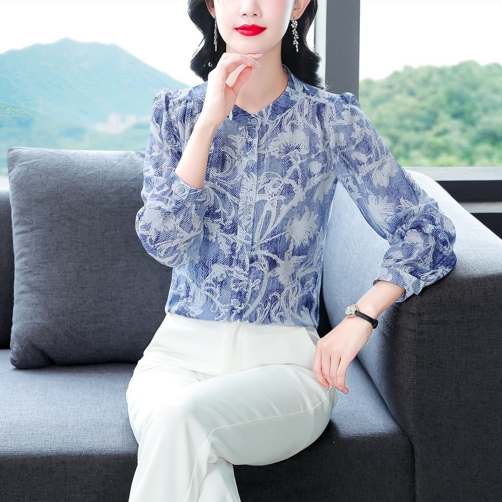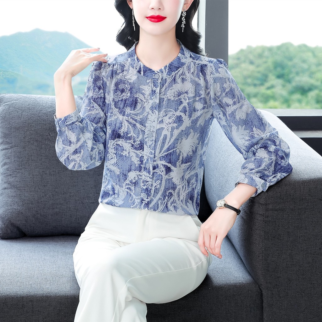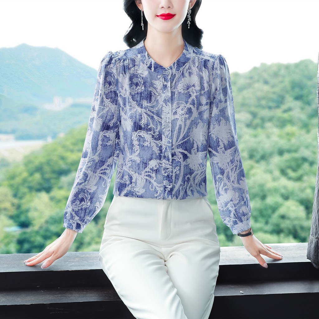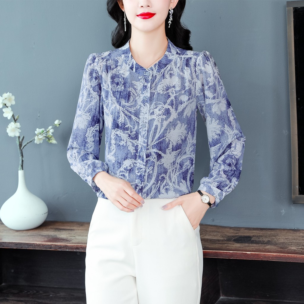 Kain Berkualitas Tinggi Korea Fashion Lengan Panjang Biru Blus Sifon Kemeja Kerja Kasual Wanita