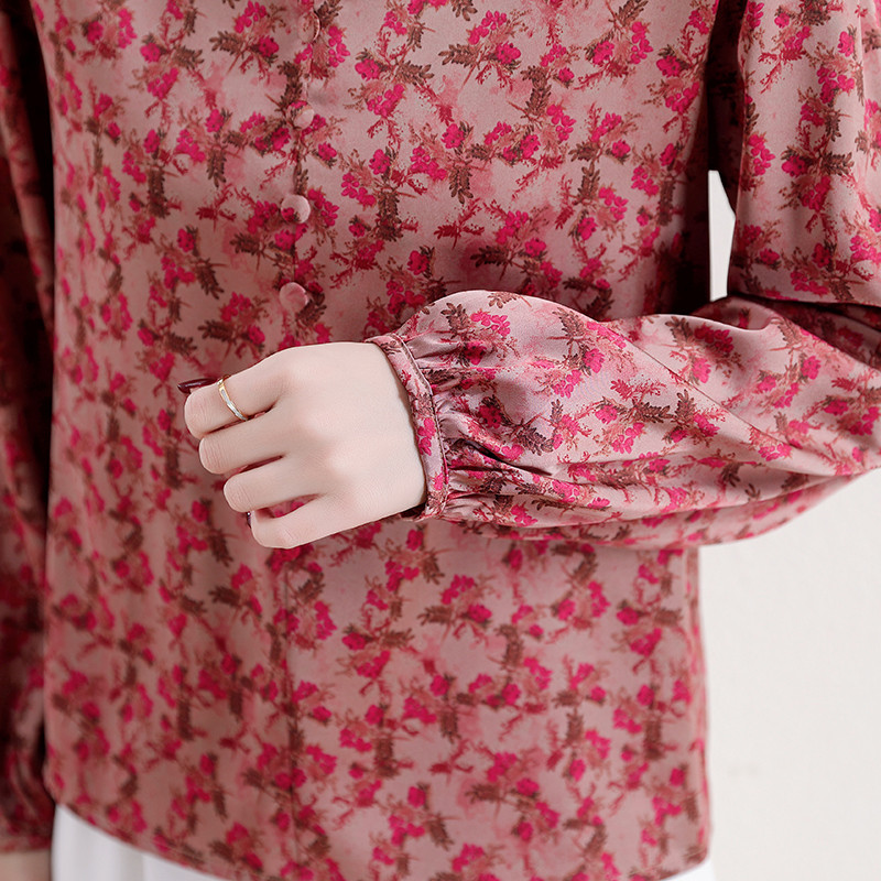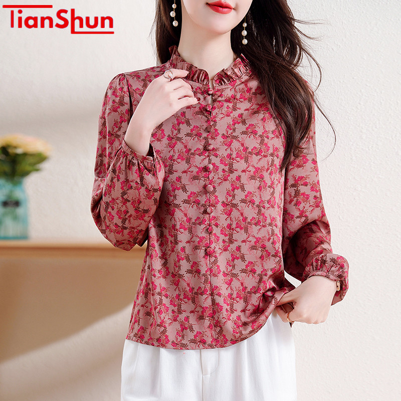 TianShun 2025 Baru Wanita Kerah Telinga Kayu Merah Dicetak Kasual is Kemeja Sifon Lengan Panjang