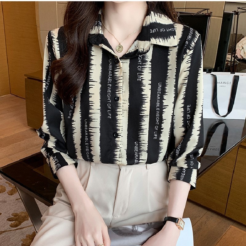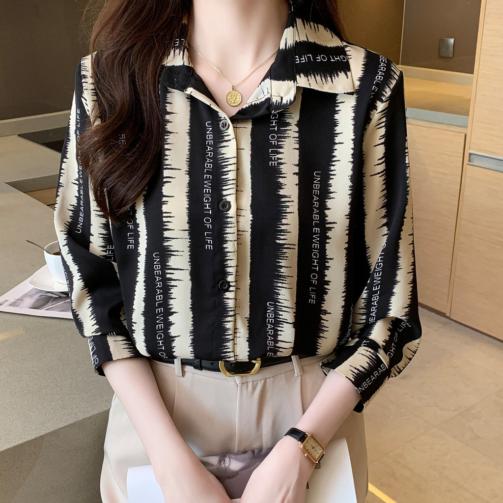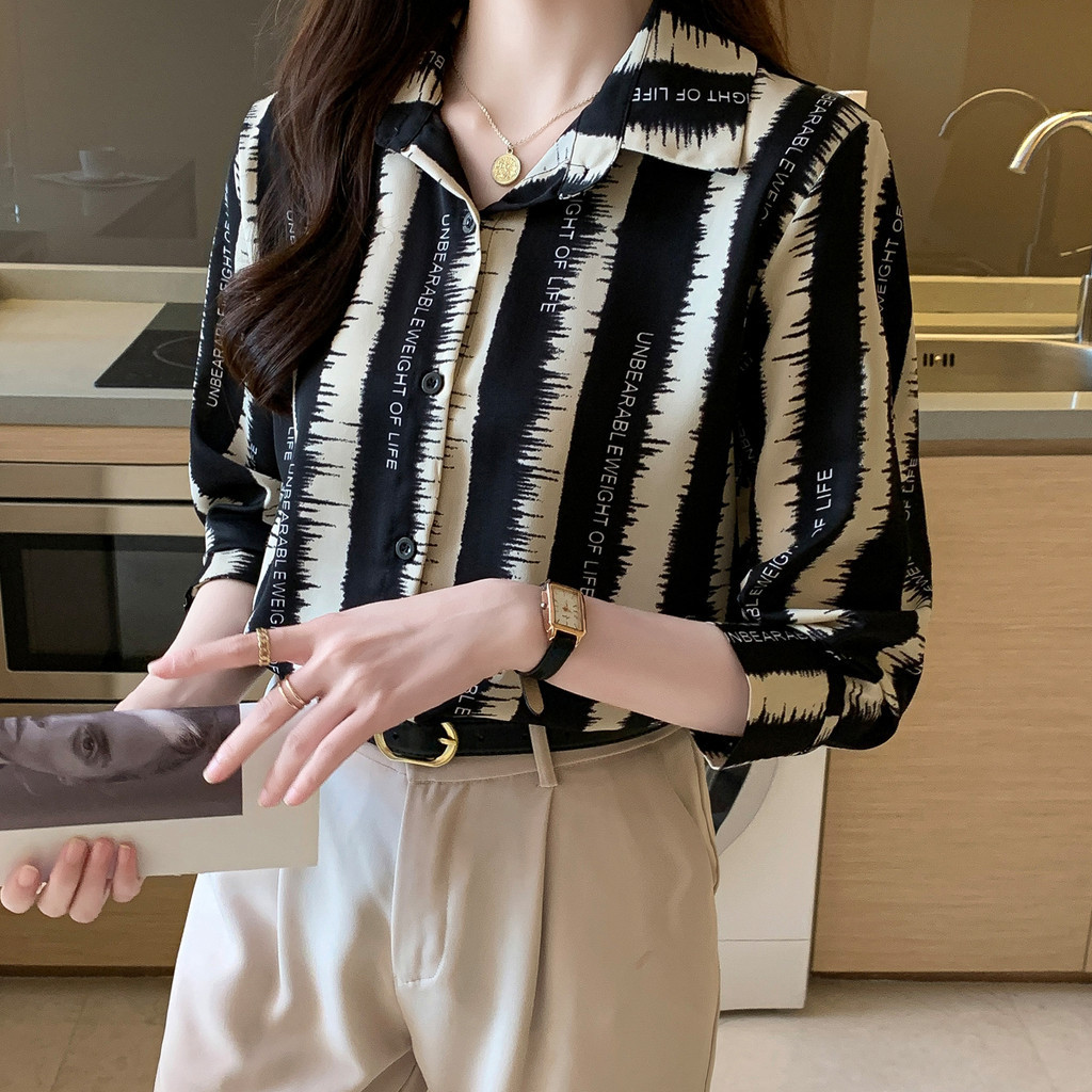 TianShun Korean Fashionable Chiffon Black Striped Shirt OL Travel Long Sleeve Tops for Women