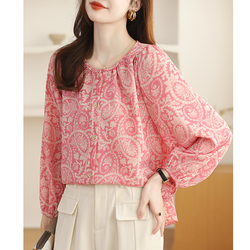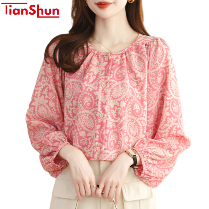 TianShun Gentle Pink Paisley Women's Printed Wear Long Sleeve Fashion Korean Style Chiffon Loose Top