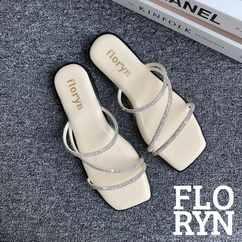 FLORYN SHOES - VELIA Cream Sandal Teplek Wanita Daily Tali Silang Permata Kekinian Elegan Flat Datar