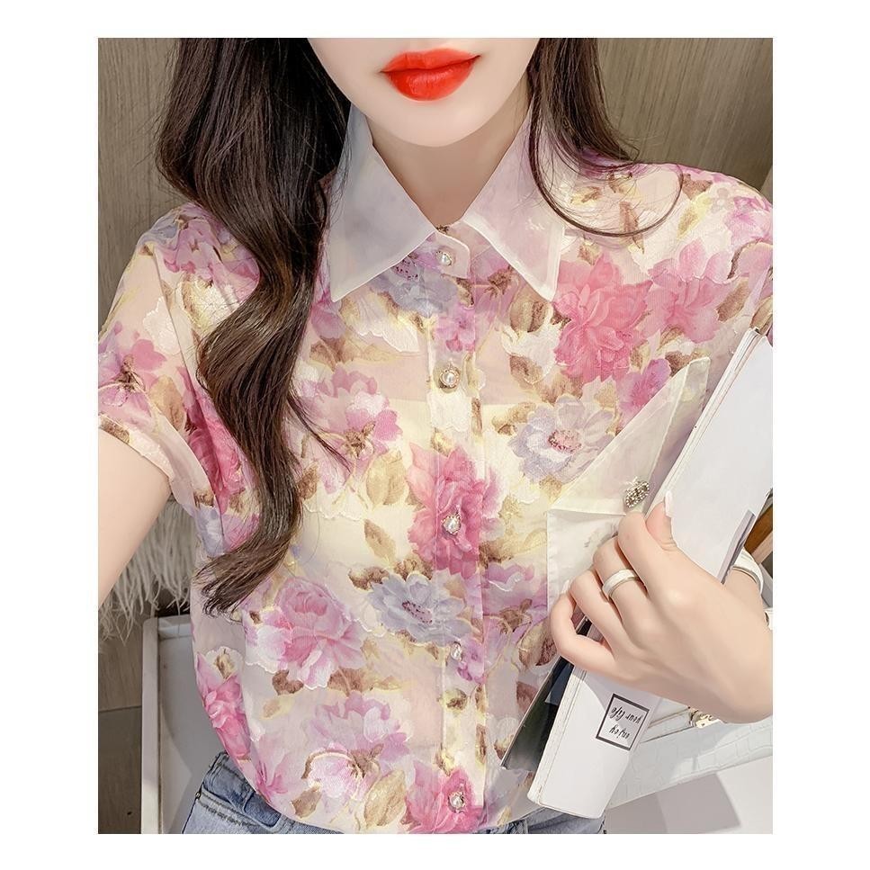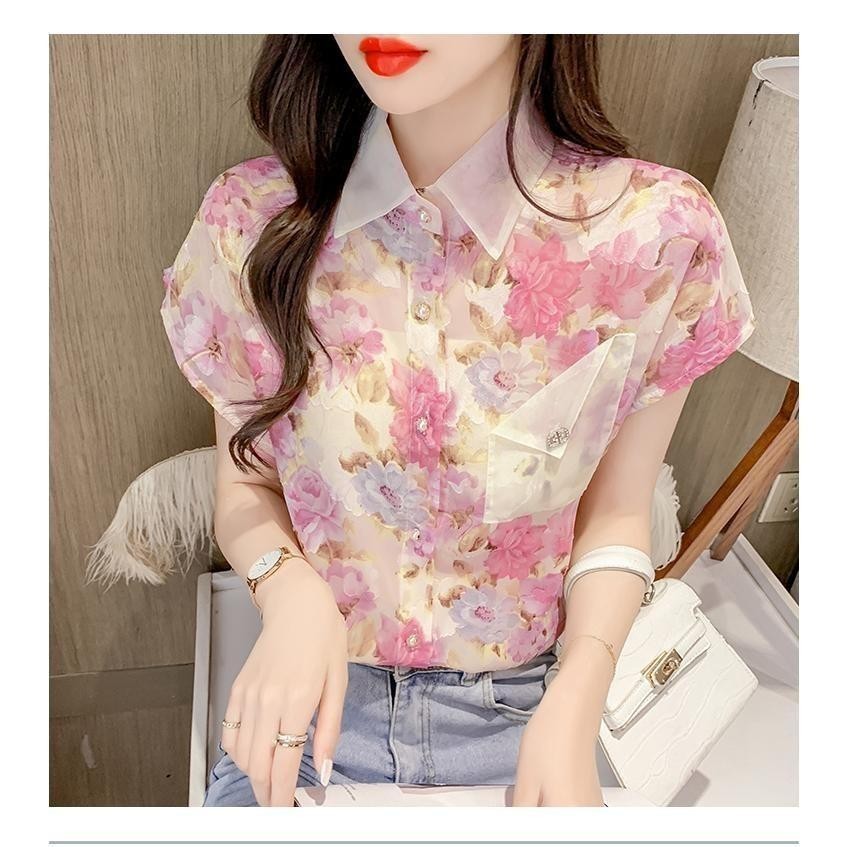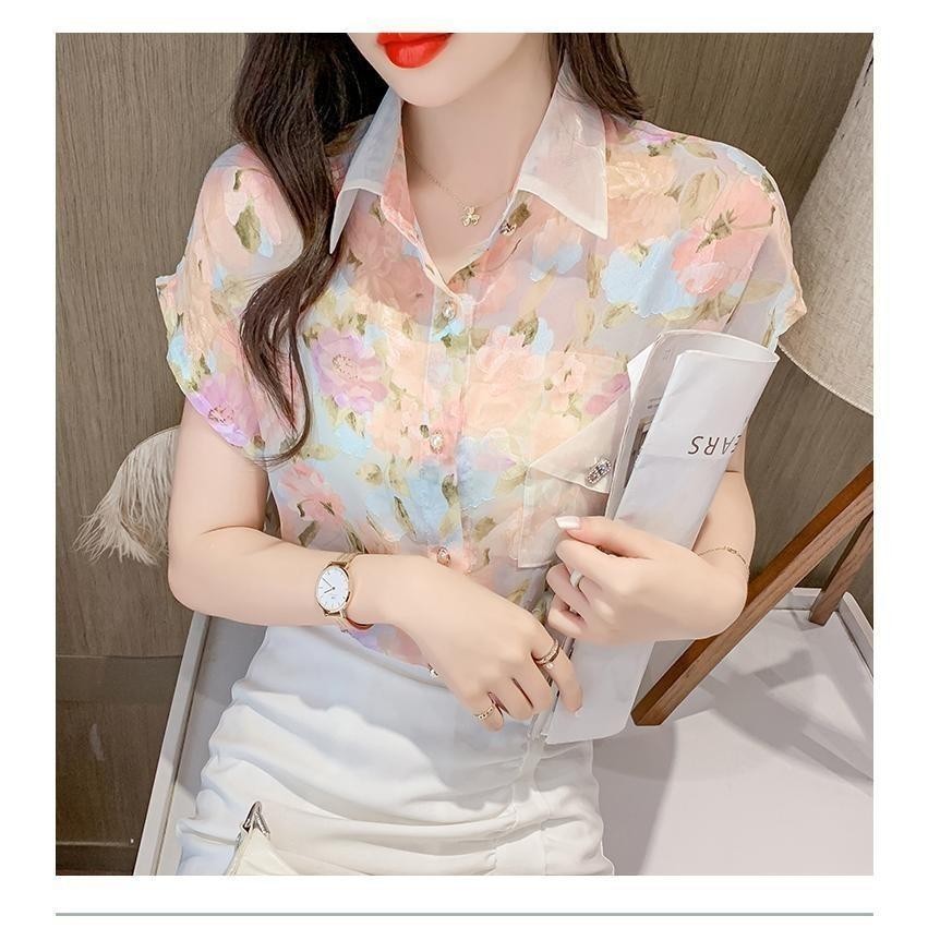 Kemeja lengan pendek berkerah Kemeja sifon motif floral bunga kemeja wanita gaya korea #W328#Short sleeve shirt, collar,
