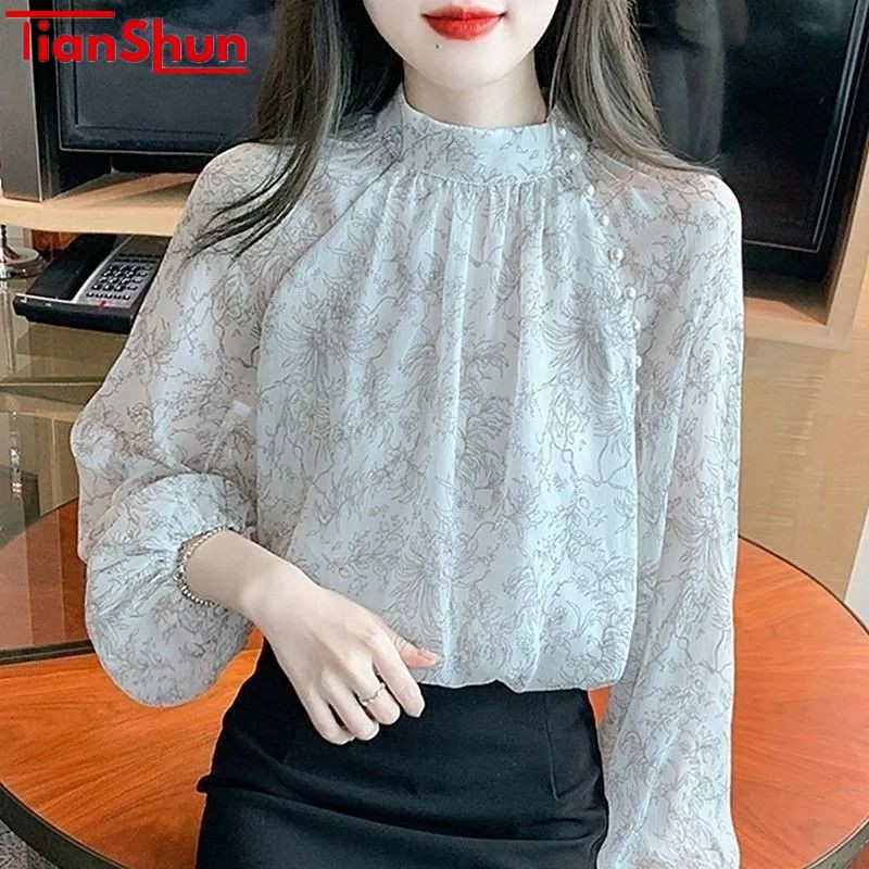TianShun Kemeja Wanita Sifon Asing Fashion Bertabur Atasan Pesta Kerja Lengan Panjang