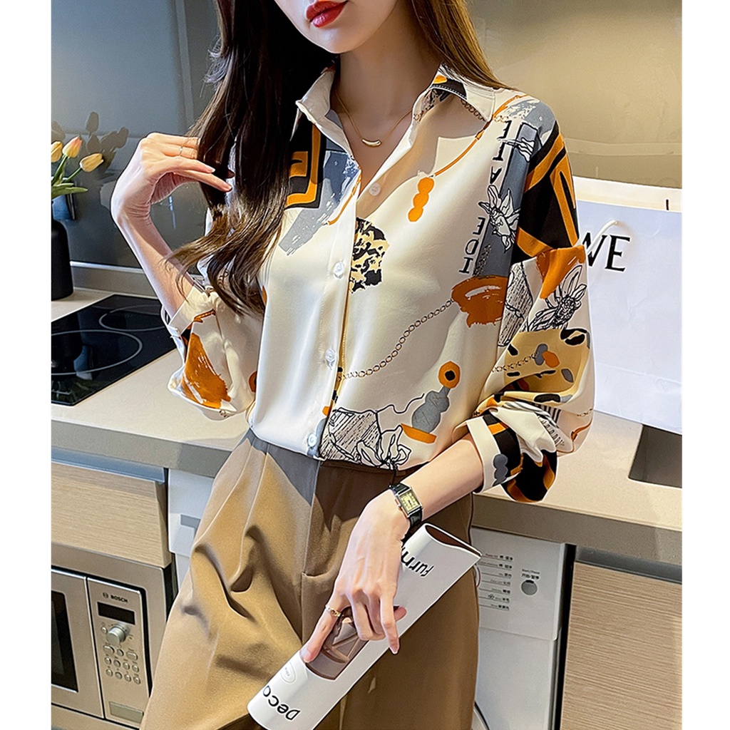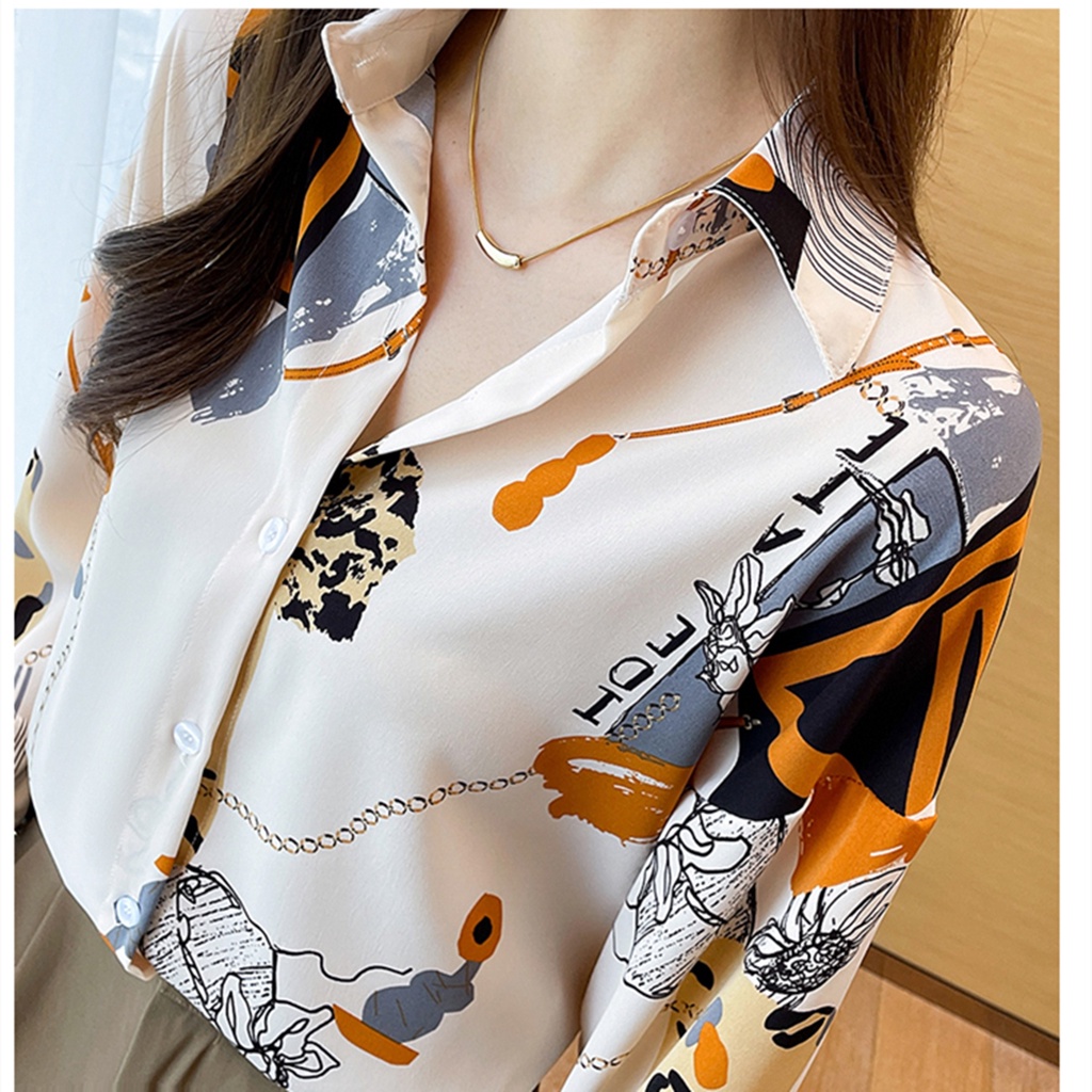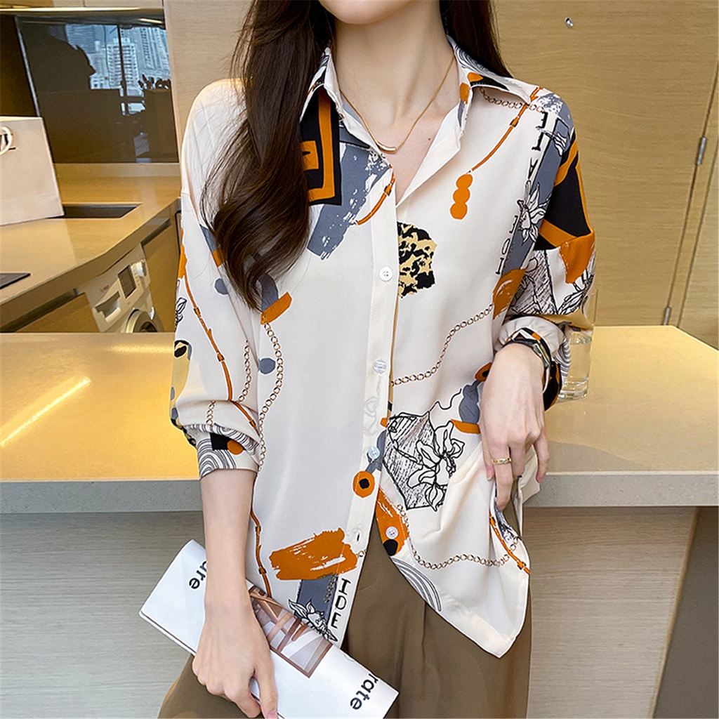 High Quality Fabric New Fashion Loose Chiffon Long Sleeve Shirt for Women Korean Style Red Printed Casual Work Shirts