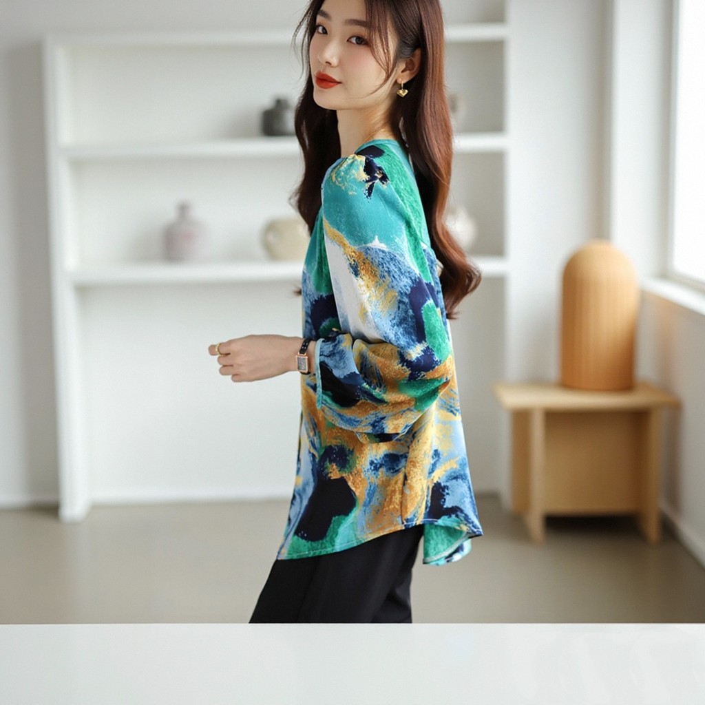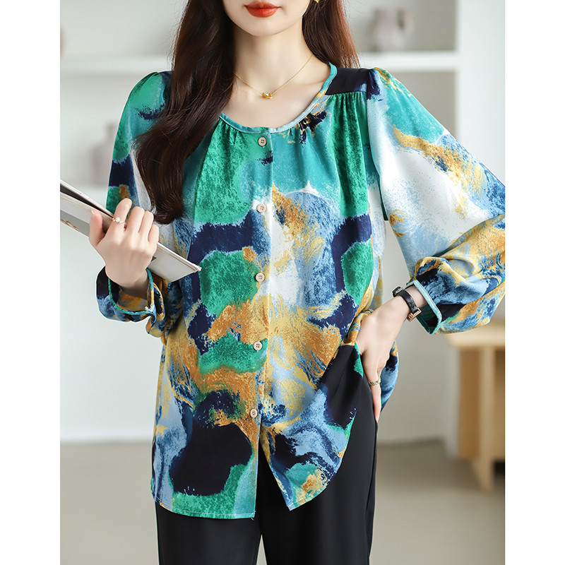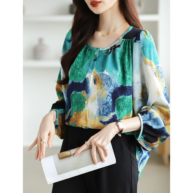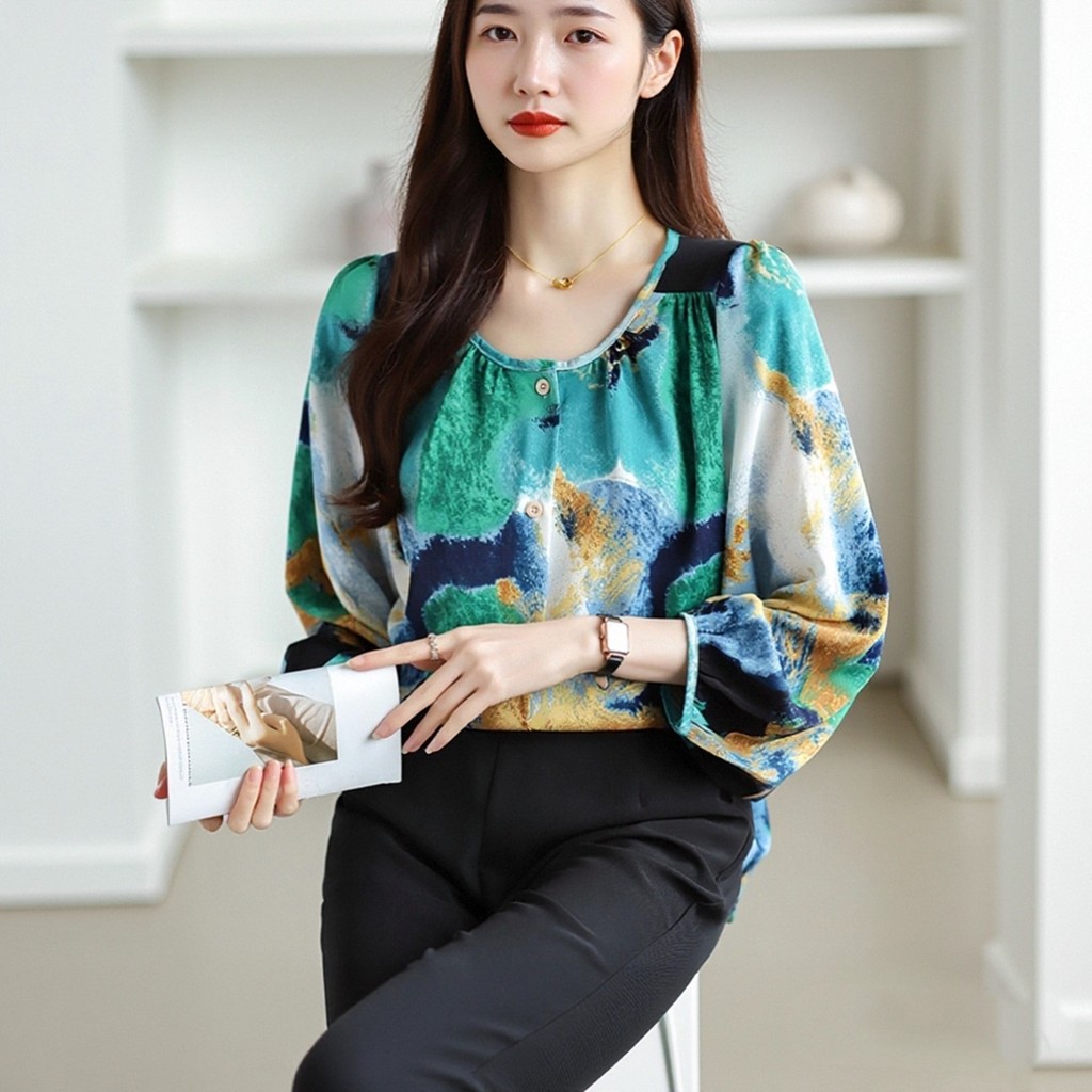 Korean Longgar Blus sifon hijau lengan panjang Kemeja Wanita Kerah Bulat Santai untuk Bepergian
